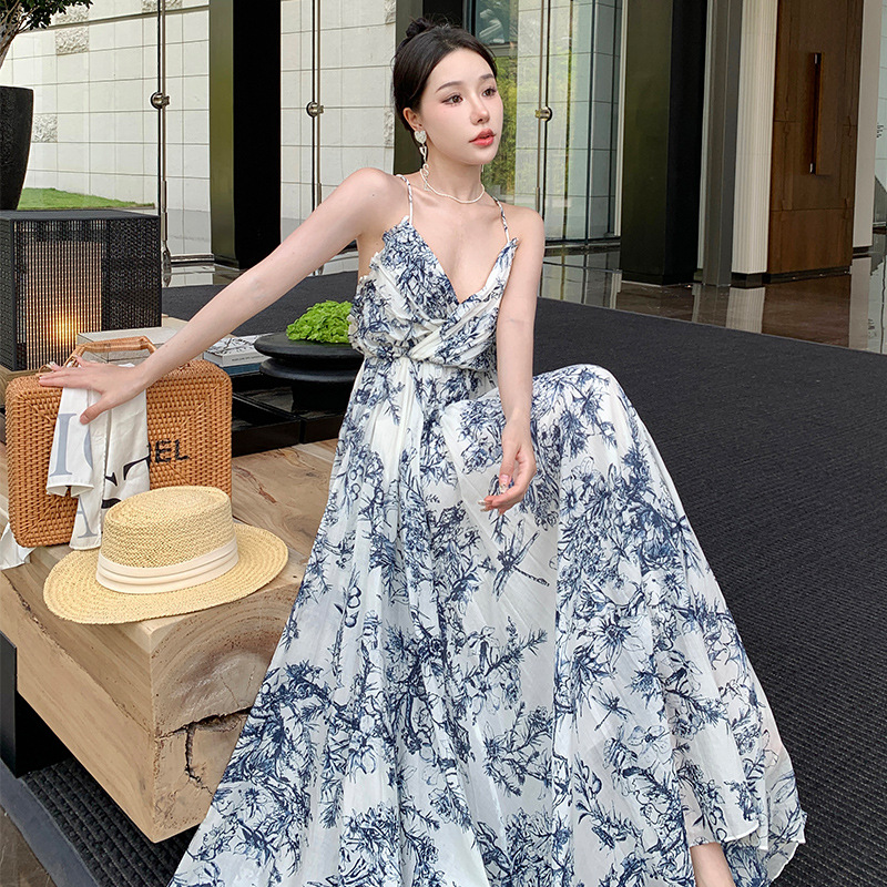夏季法式优雅气质花卉时尚吊带裙超大摆印花系带露背长版连衣裙子
