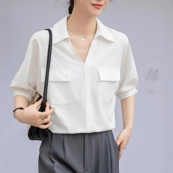 法式白色V领衬衣女夏季新款设计感百搭简约通勤职业短袖衬衫