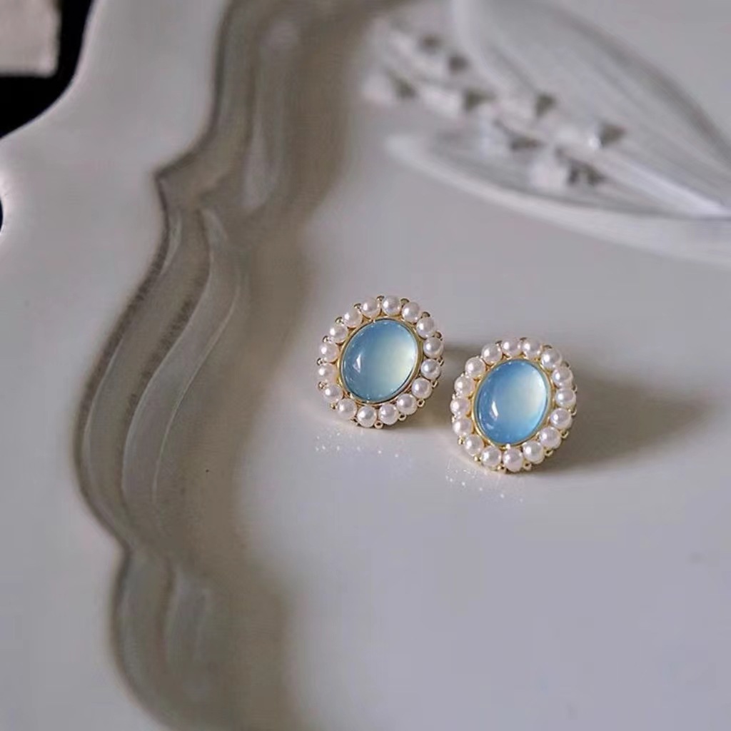 《蔚蓝海》复古港风气质高级感珍珠蓝色 猫眼石耳钉耳环蚊香盘耳夹