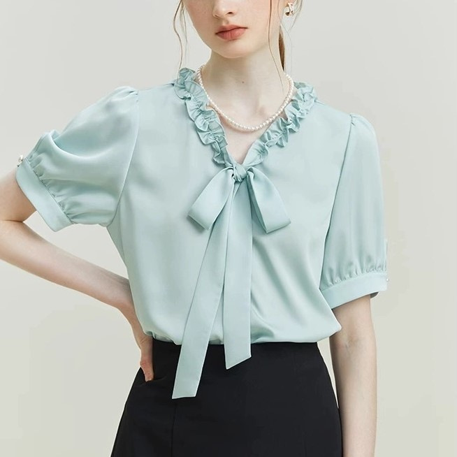 法式木耳边V领衬衫女夏季新款蝴蝶结衬衣