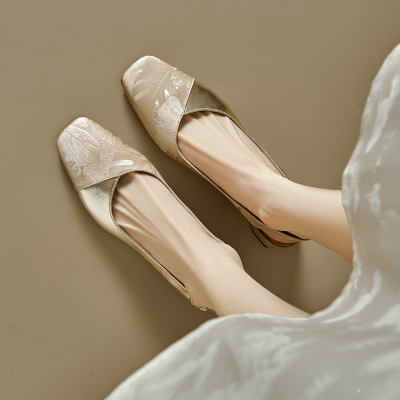 复古印花新中式方头包头凉鞋女粗跟夏新中跟单鞋