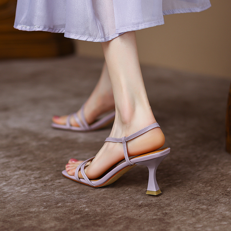 交叉绑带露趾凉鞋女夏紫色百搭细高跟鞋