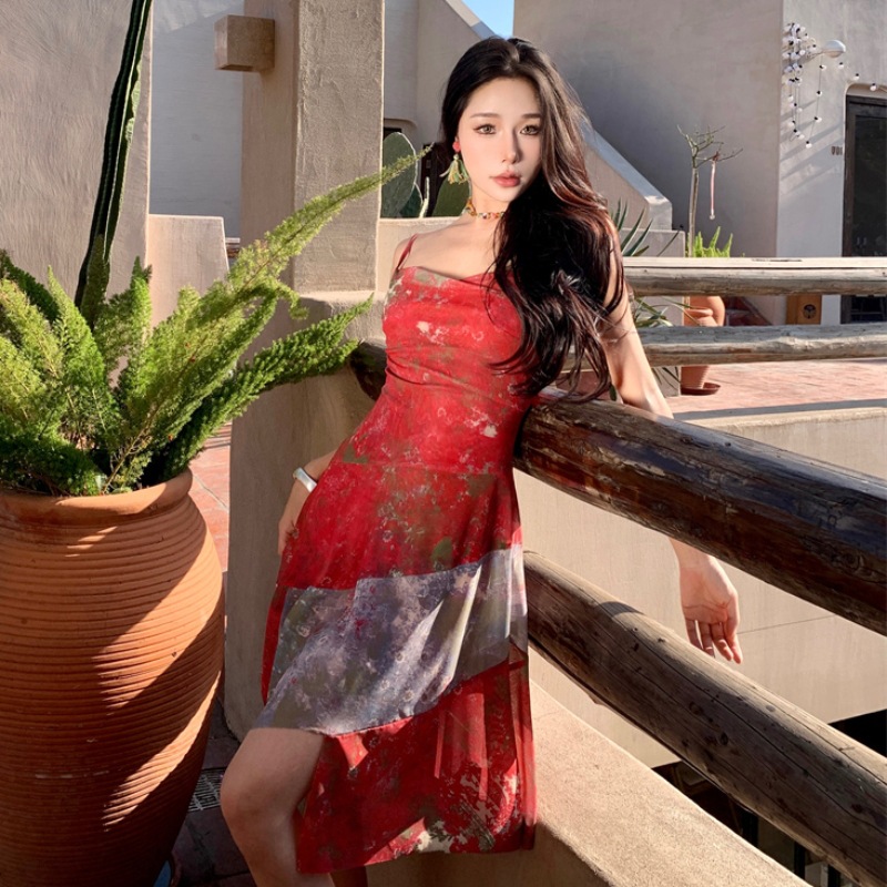 法式辣妹吊带连衣裙女夏季收腰中长裙小众设计感不规则网纱裙子潮