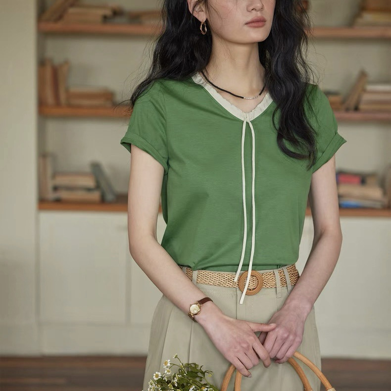 法式莱赛尔绿色v领系带T恤女夏季2025新款正肩短袖上衣