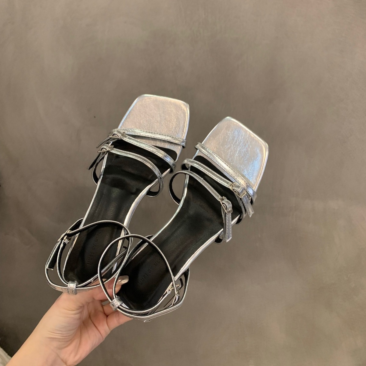 法式中高跟一字带凉鞋仙女鞋子新款夏季气质银色粗跟罗马鞋