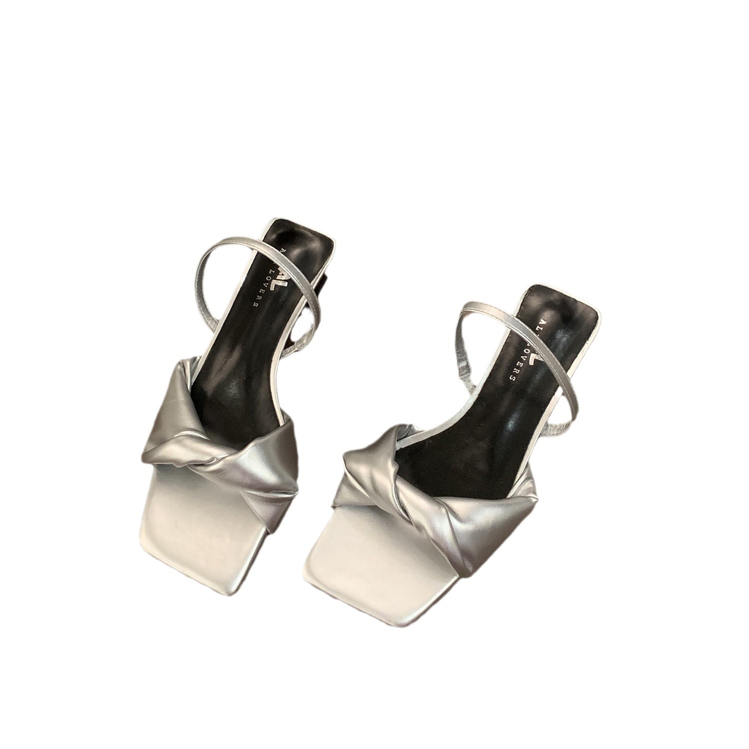 法式银色高跟鞋一字带凉鞋仙女鞋子年新款夏季方头气质罗马鞋