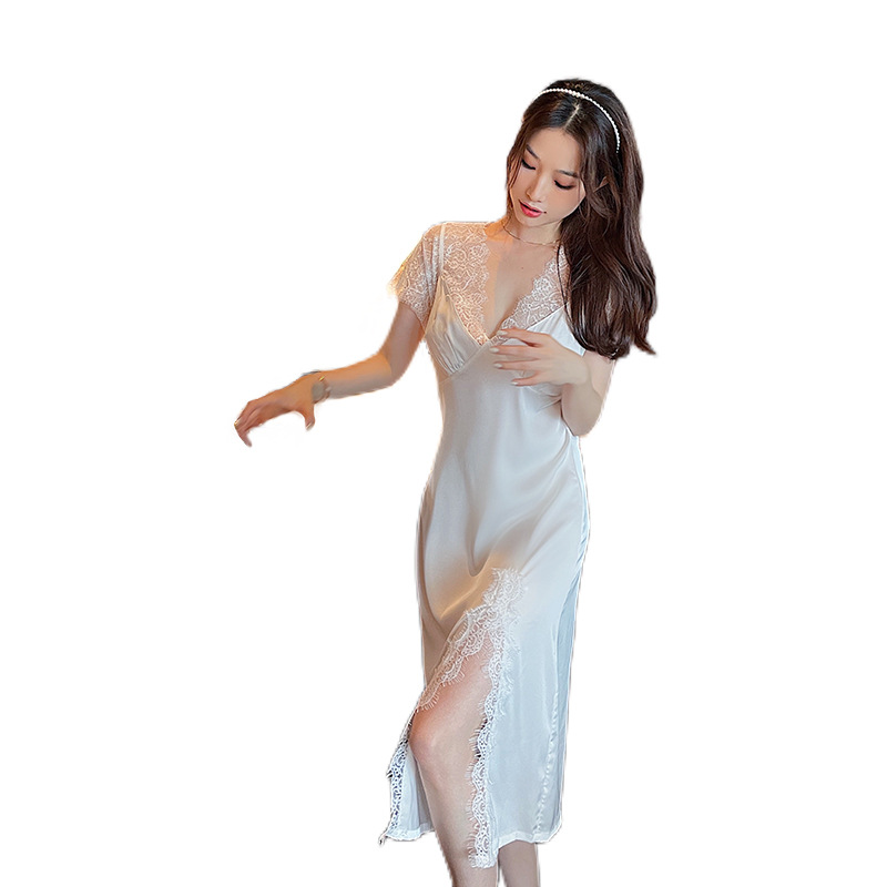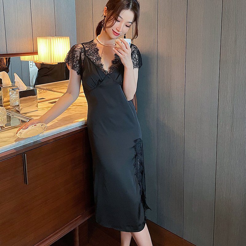 秋季长款睡裙 开叉性感女士睡衣家居服 休闲蕾丝透气季睡裙