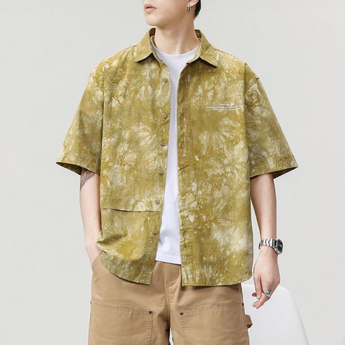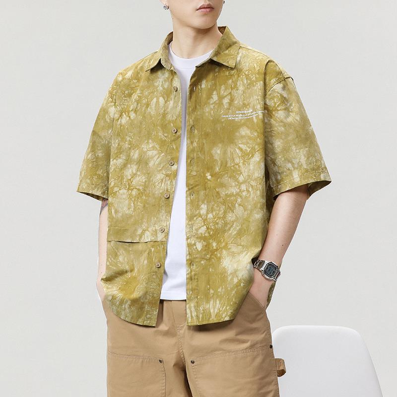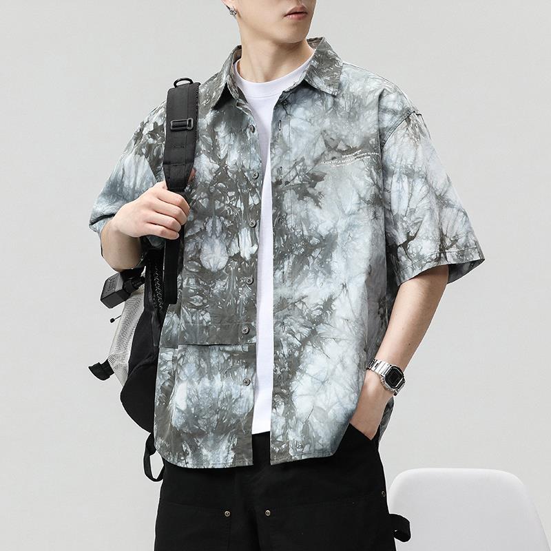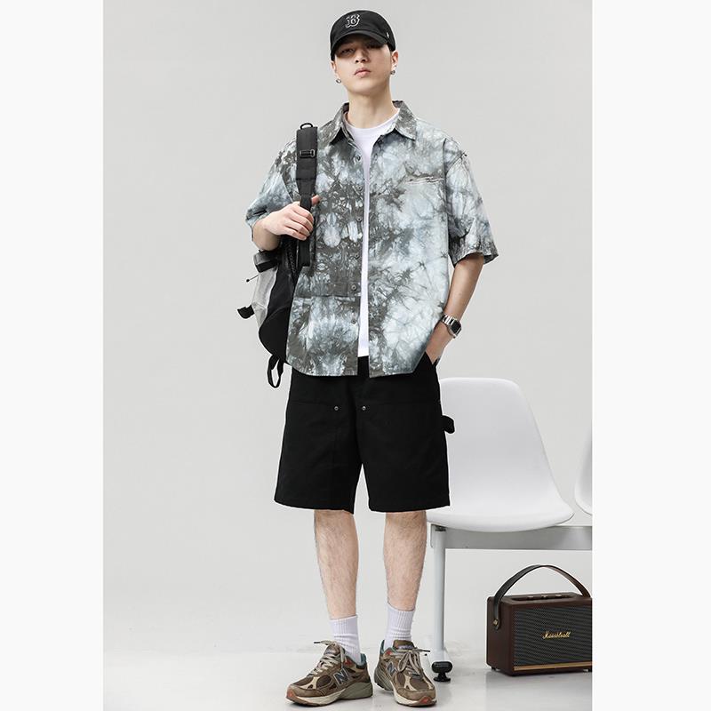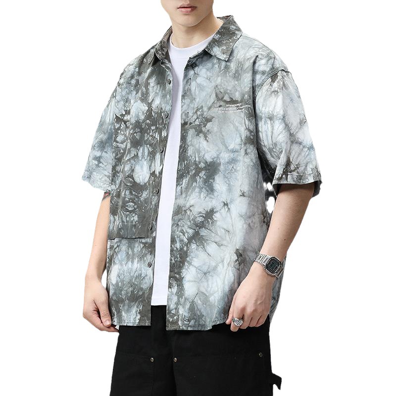 夏季薄款新款日系复古工装短袖衬衫男印花宽松休闲夏威夷半袖衬衣