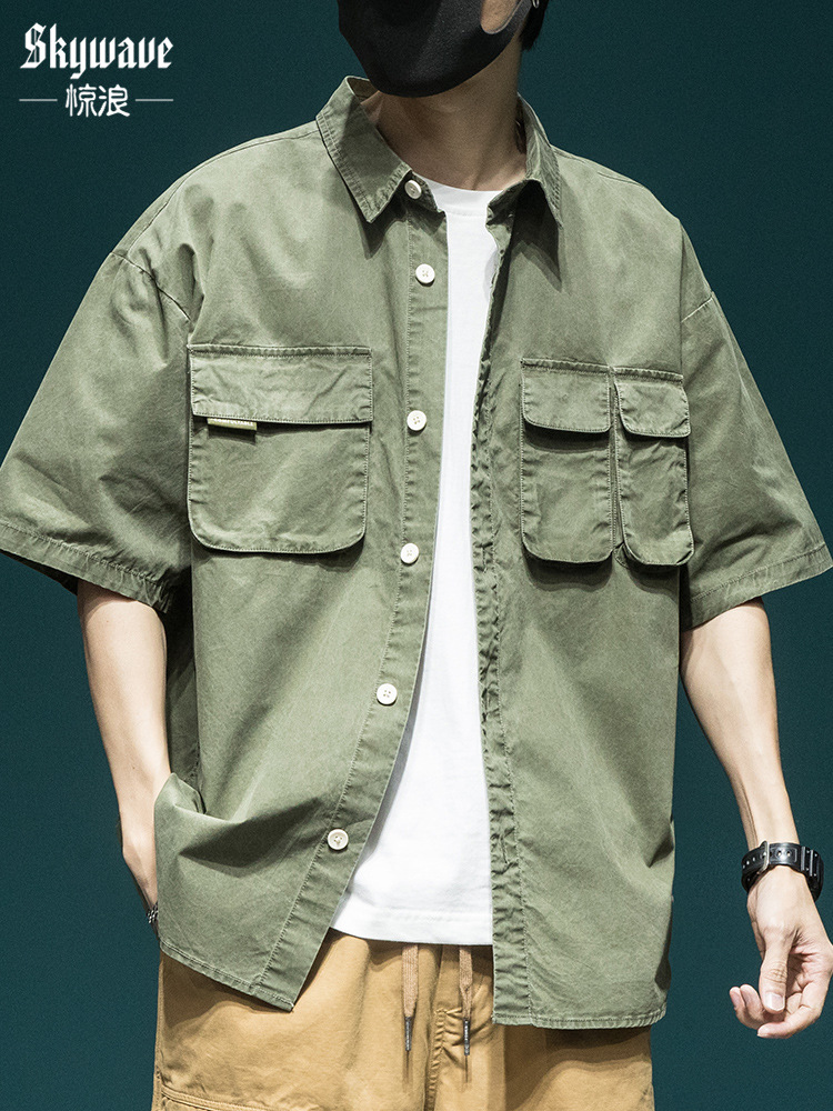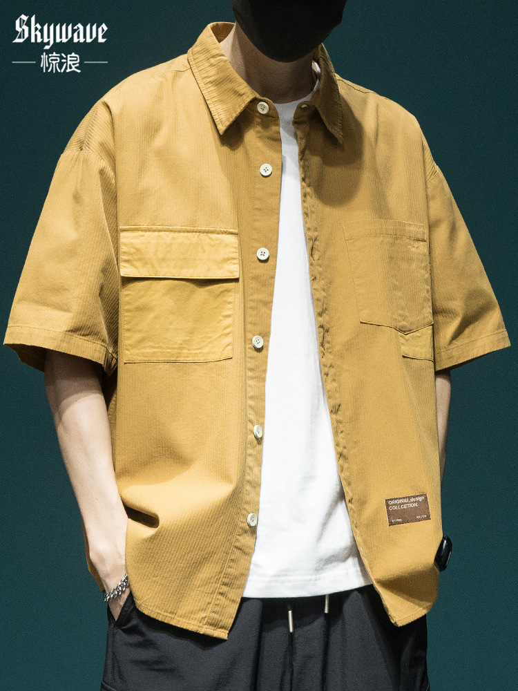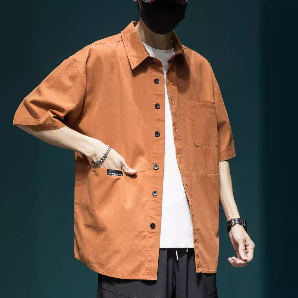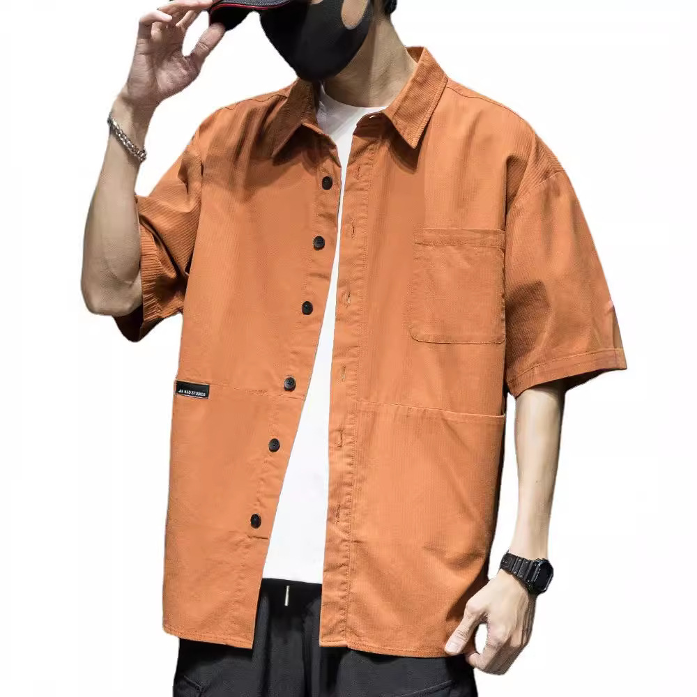 高级感橘色日系短袖衬衫男夏季新款宽松大码工装衬衣痞帅翻领上衣