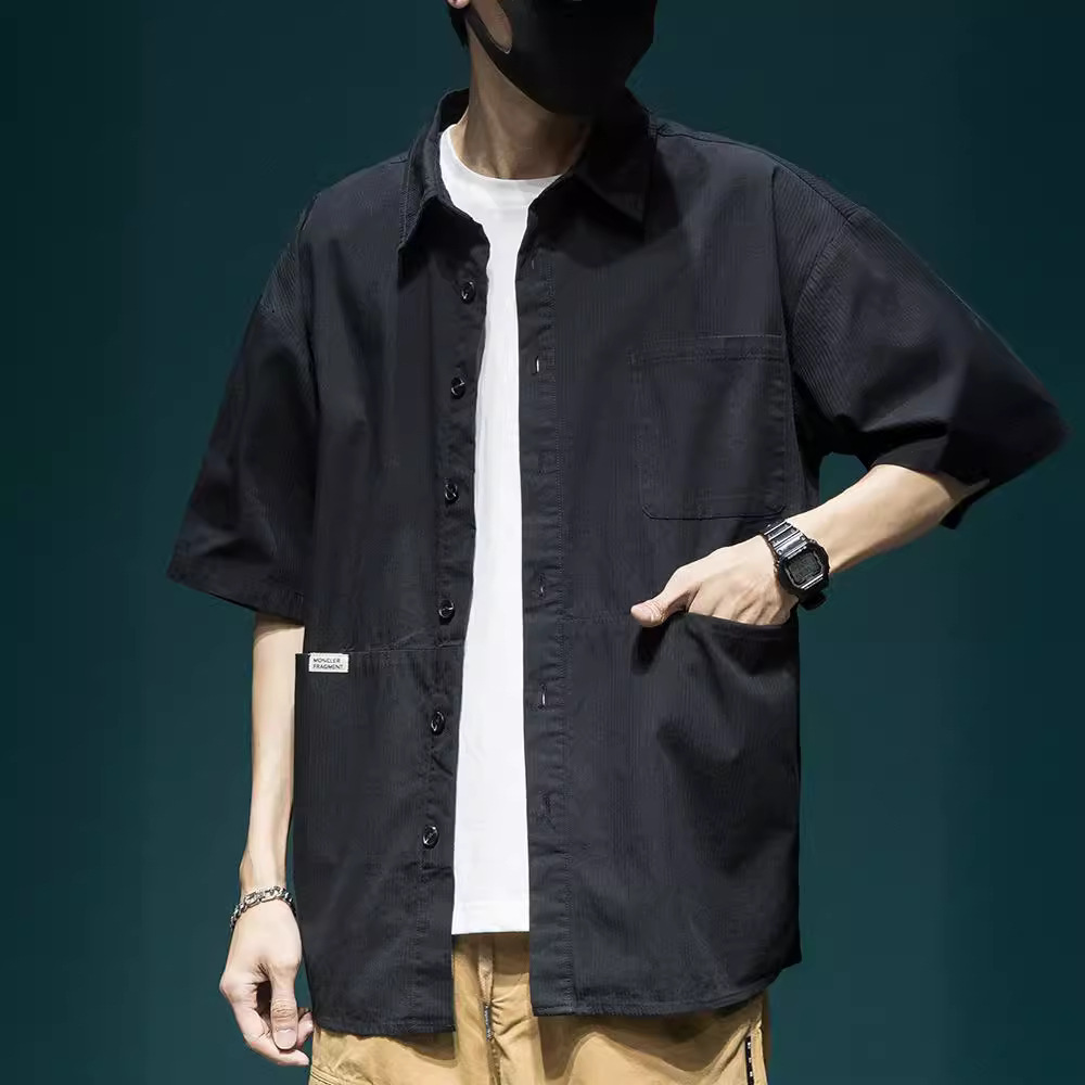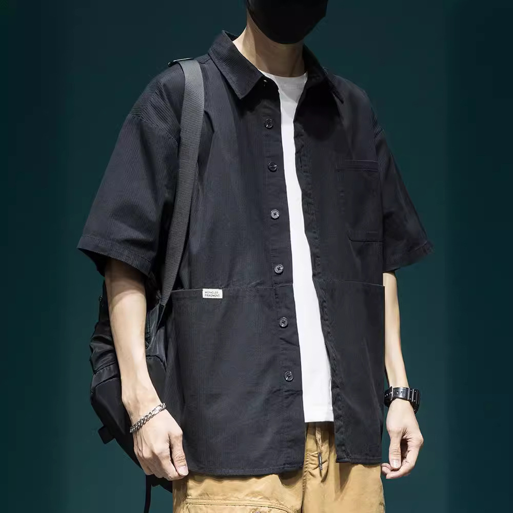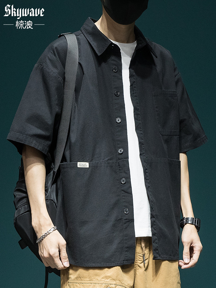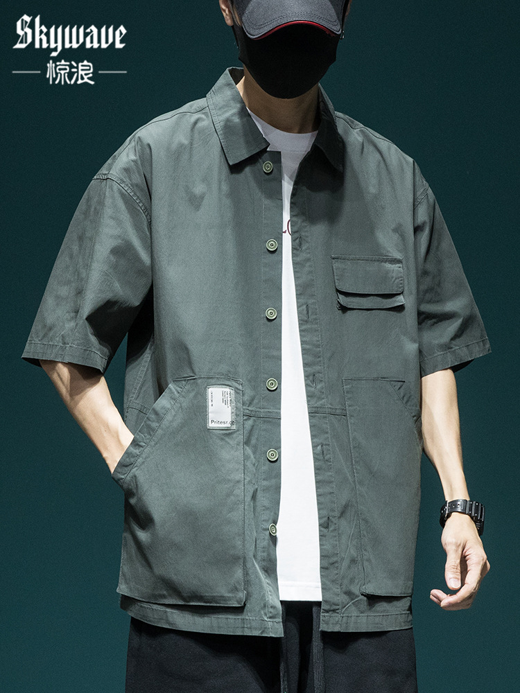 高级感橘色日系短袖衬衫男夏季新款宽松大码工装衬衣痞帅翻领上衣