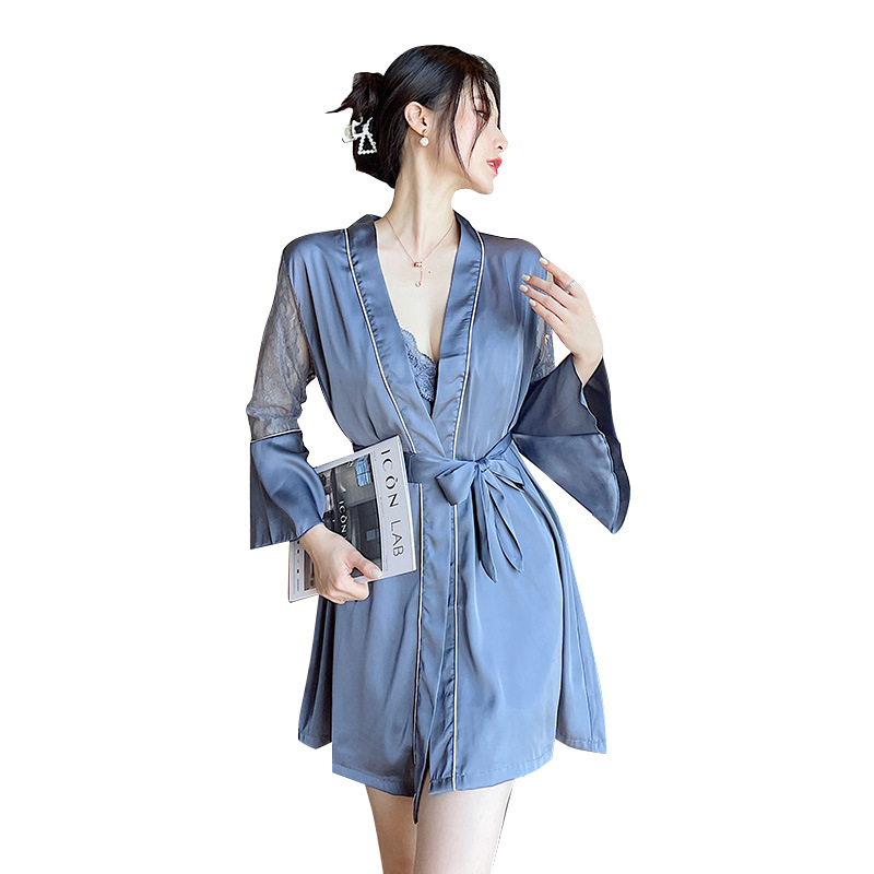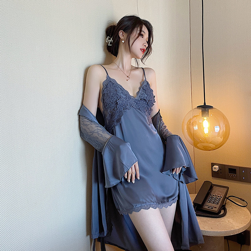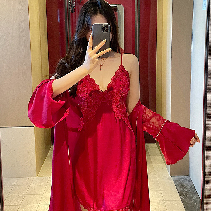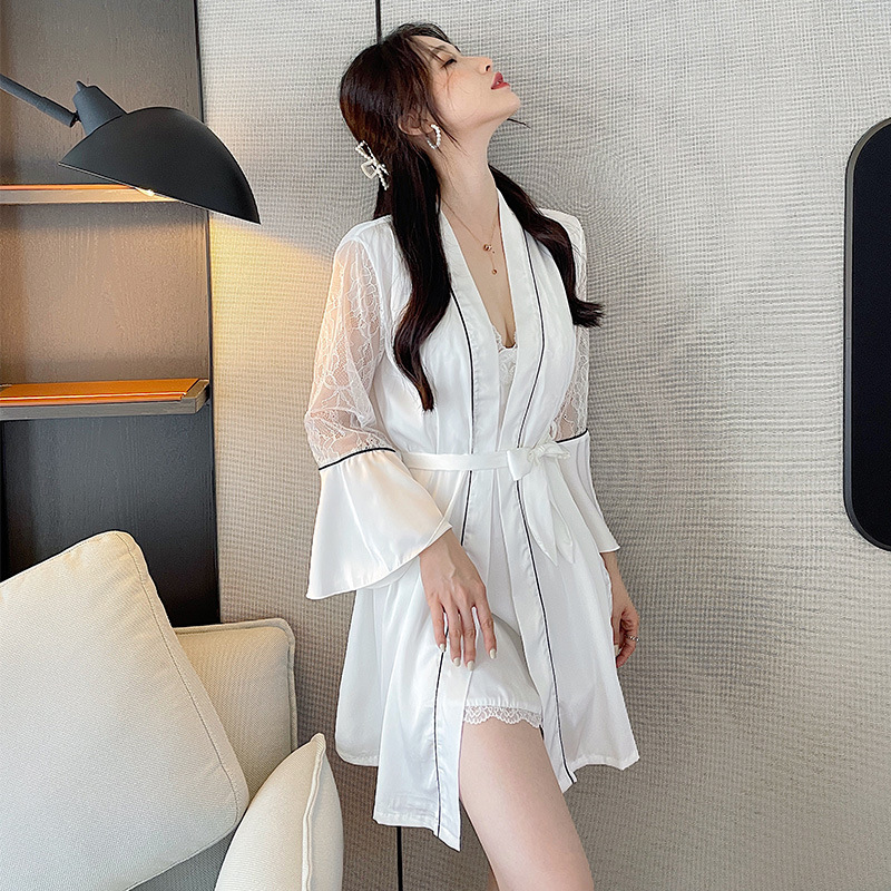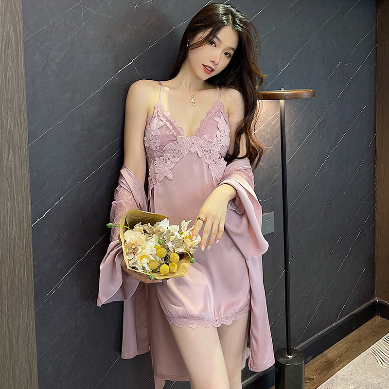 款拼接长袖睡袍吊带裙两件套薄款冰丝绸女式家居服睡衣