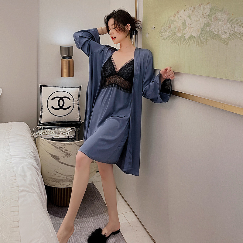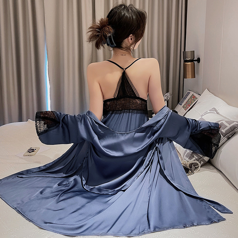 冰丝睡衣女春秋款吊带睡袍两件套宫廷风美背性感妩媚蕾丝家居服