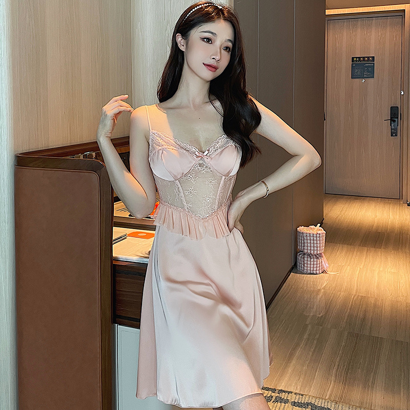 夏季吊带睡裙性感露腰镂空女士家居服睡裙丝滑透气带胸垫情趣睡衣
