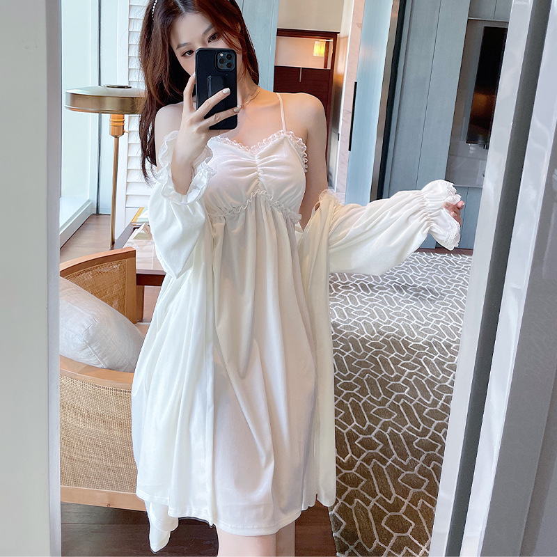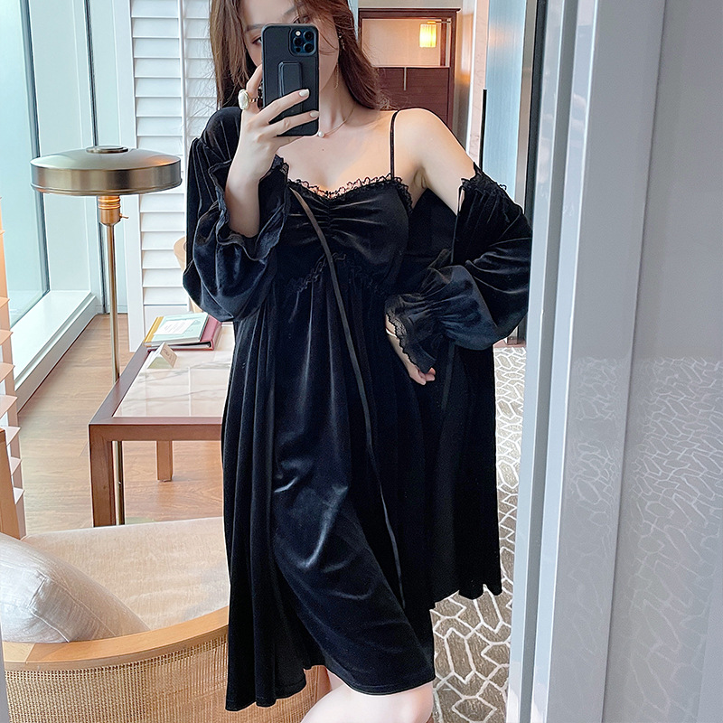 睡衣女金丝绒两件套家居服性感风带胸垫睡裙睡袍套装