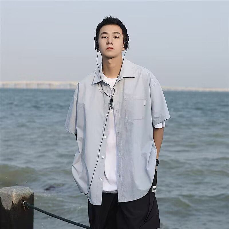 港风简单干净潮牌短袖衬衫男生宽松上衣夏季新款美式休闲半袖衬衣