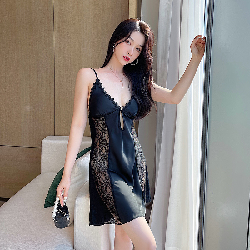 性感镂空蕾丝侧边低胸缎面雪纺睡裙夏季清凉舒适带胸垫家居服吊裙