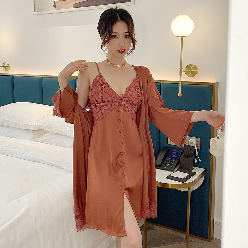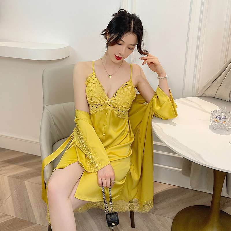 优雅水溶蕾丝花边V领睡衣两件套薄款冰丝春夏女性感开叉下摆睡裙