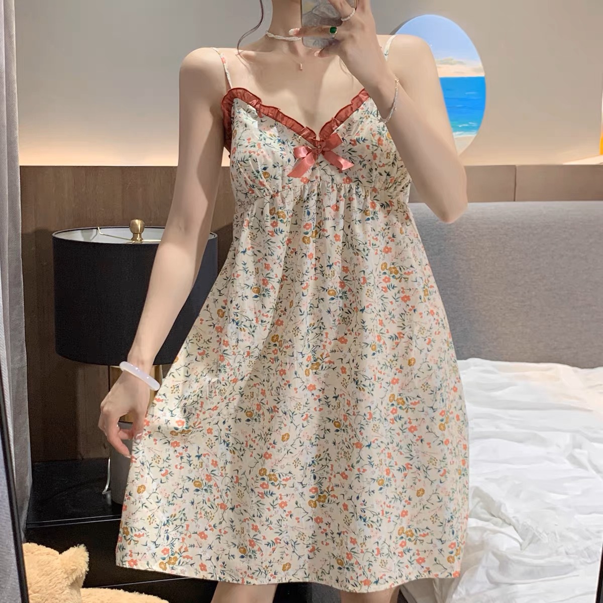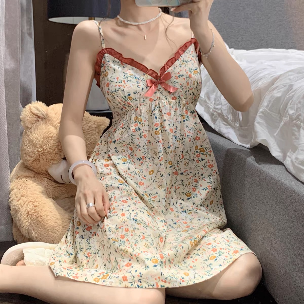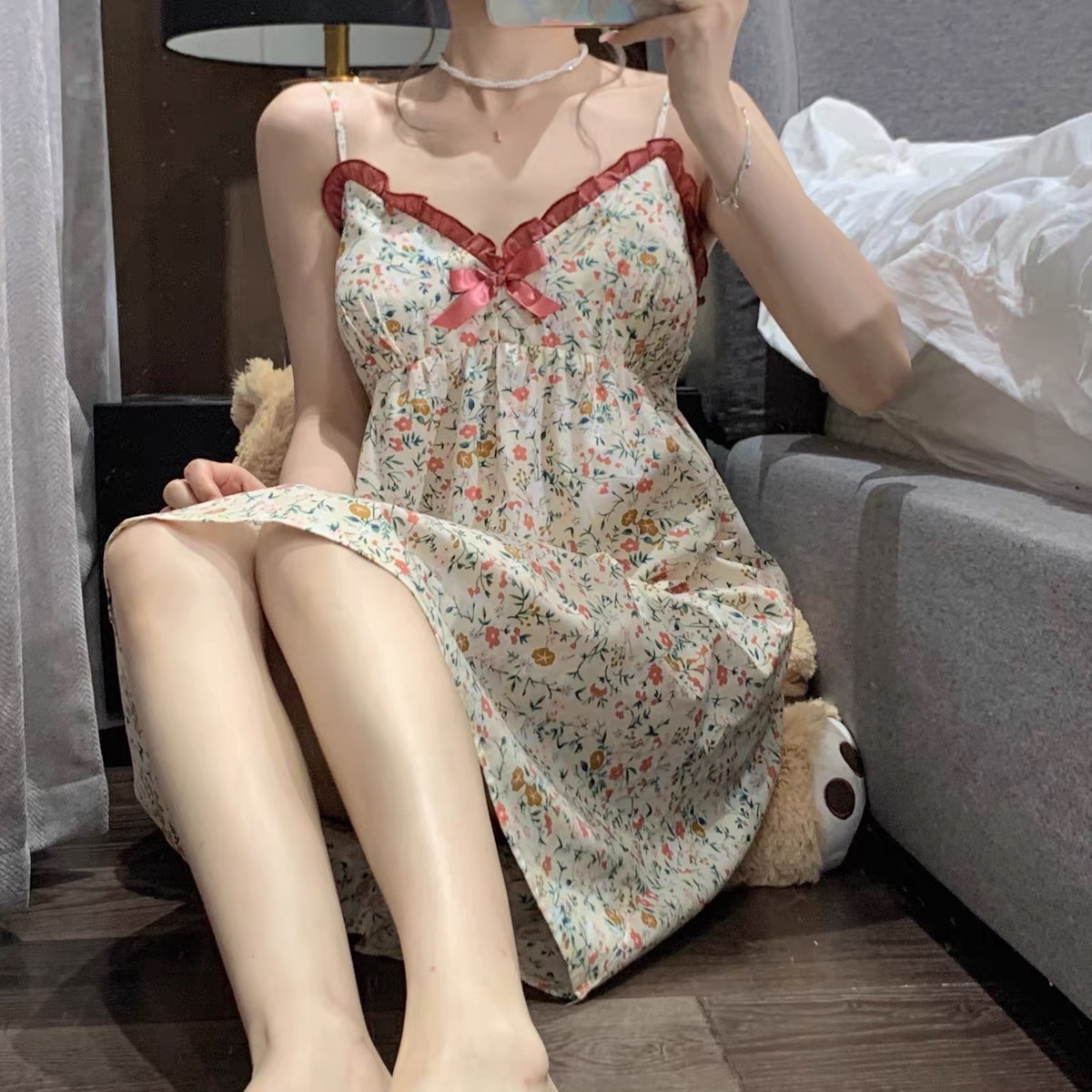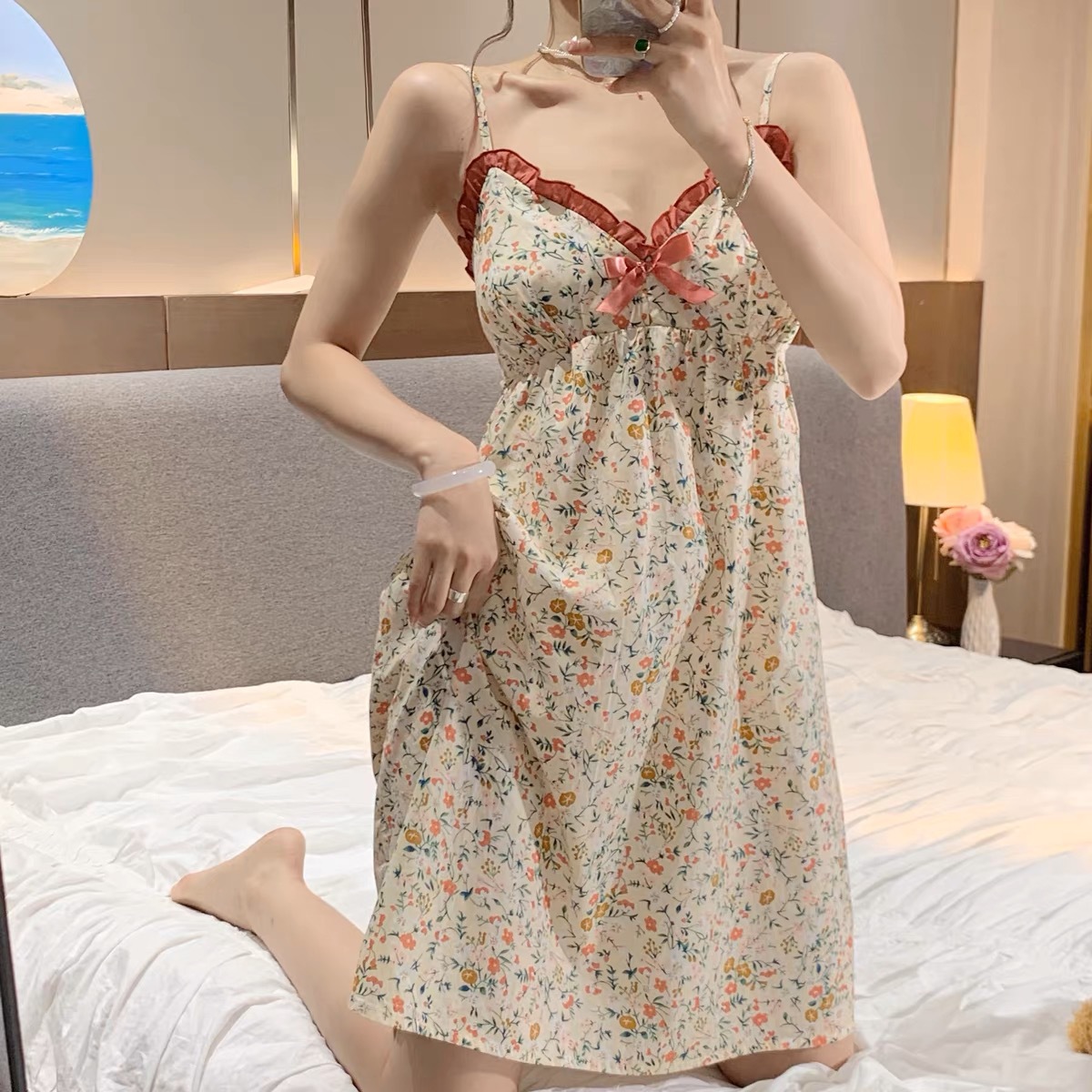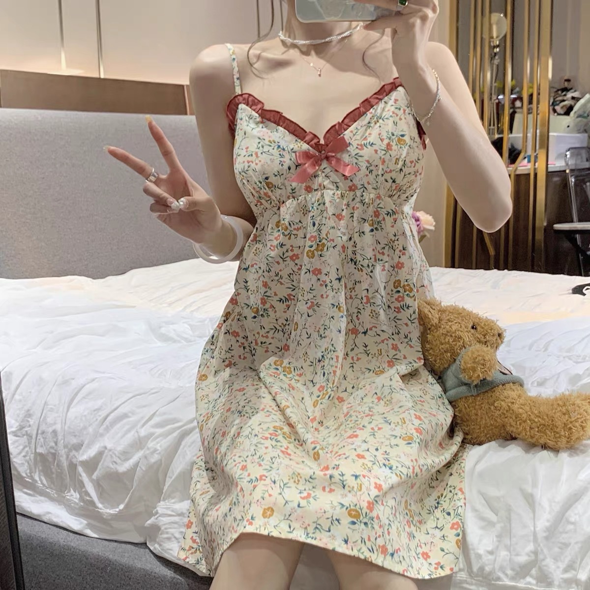 纯欲风碎花v领吊带睡裙女年新款夏季性感可爱带胸垫家居衣服
