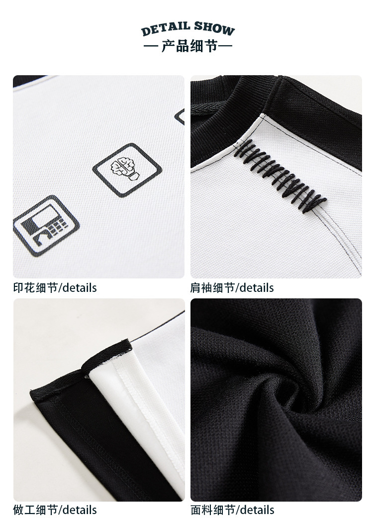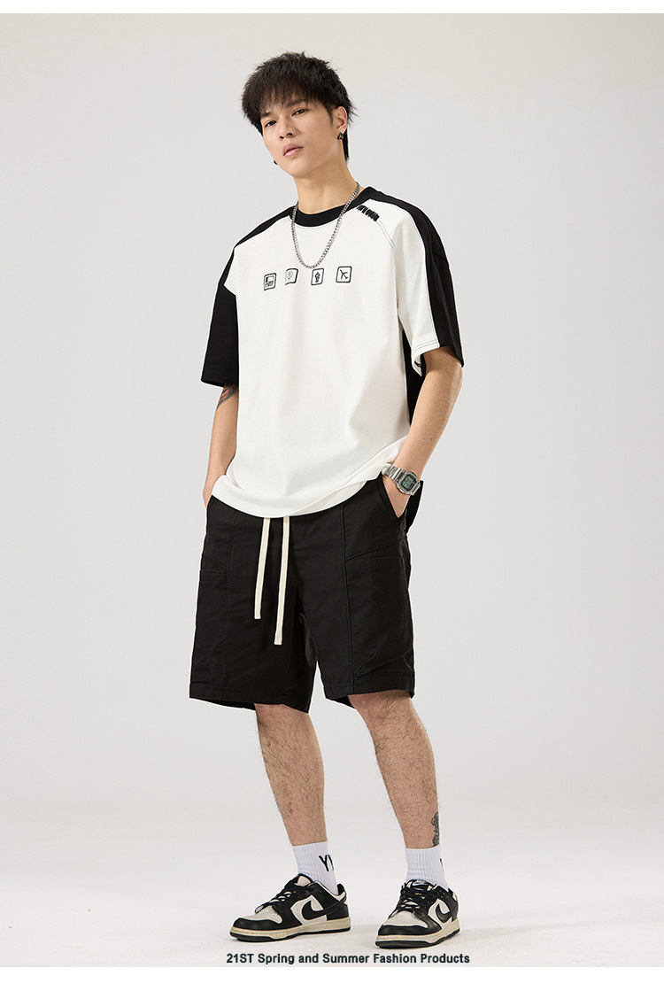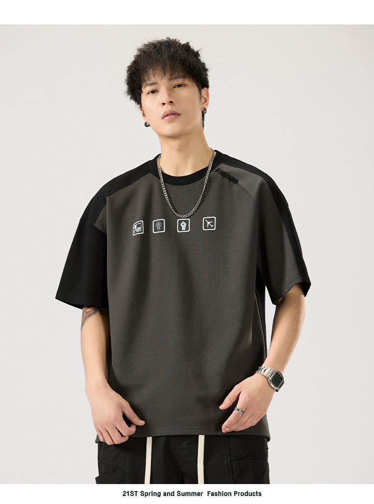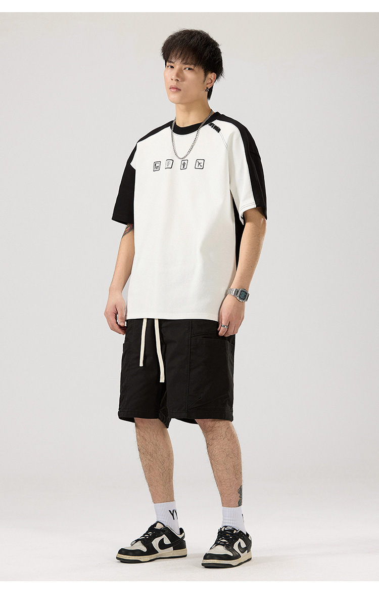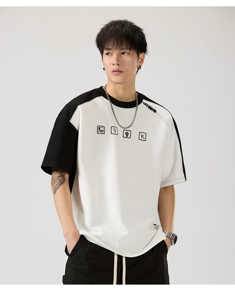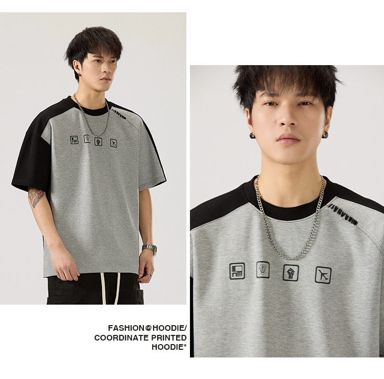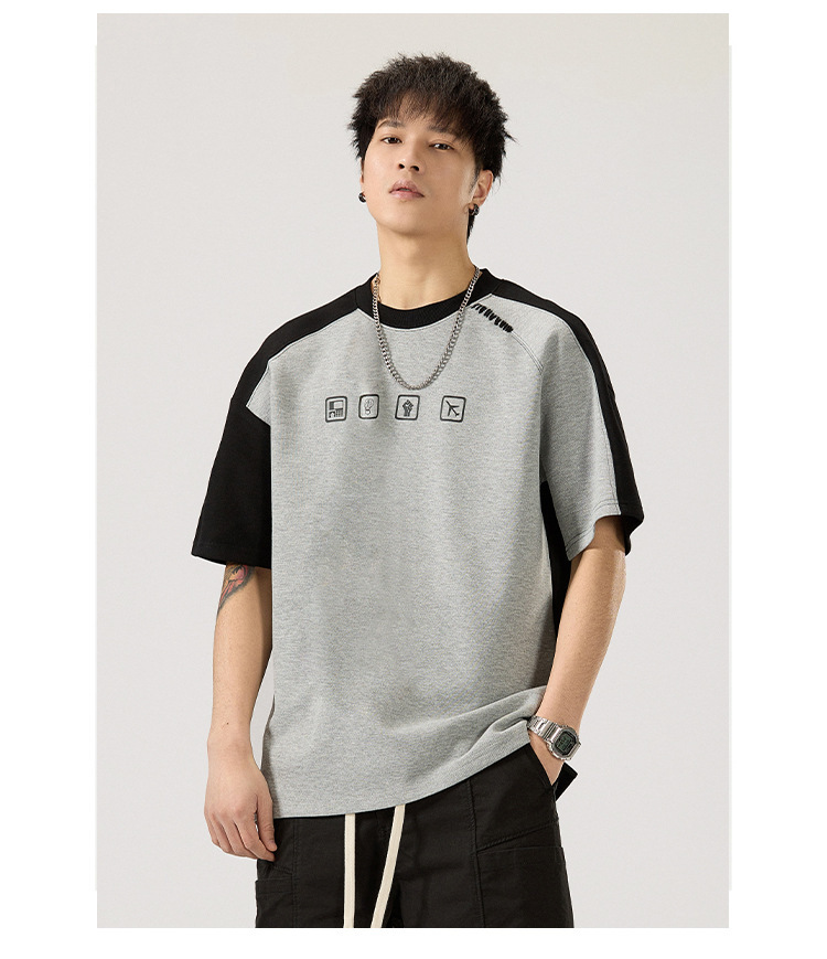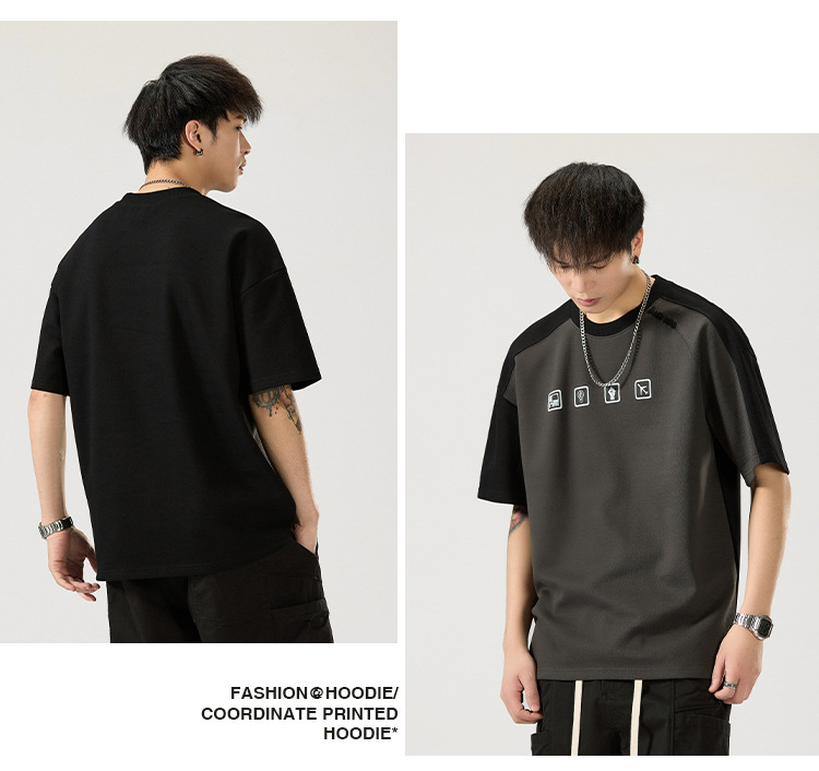 个性重磅260g插肩袖男t拼接短袖美式潮牌宽松印花休闲上衣百搭T恤