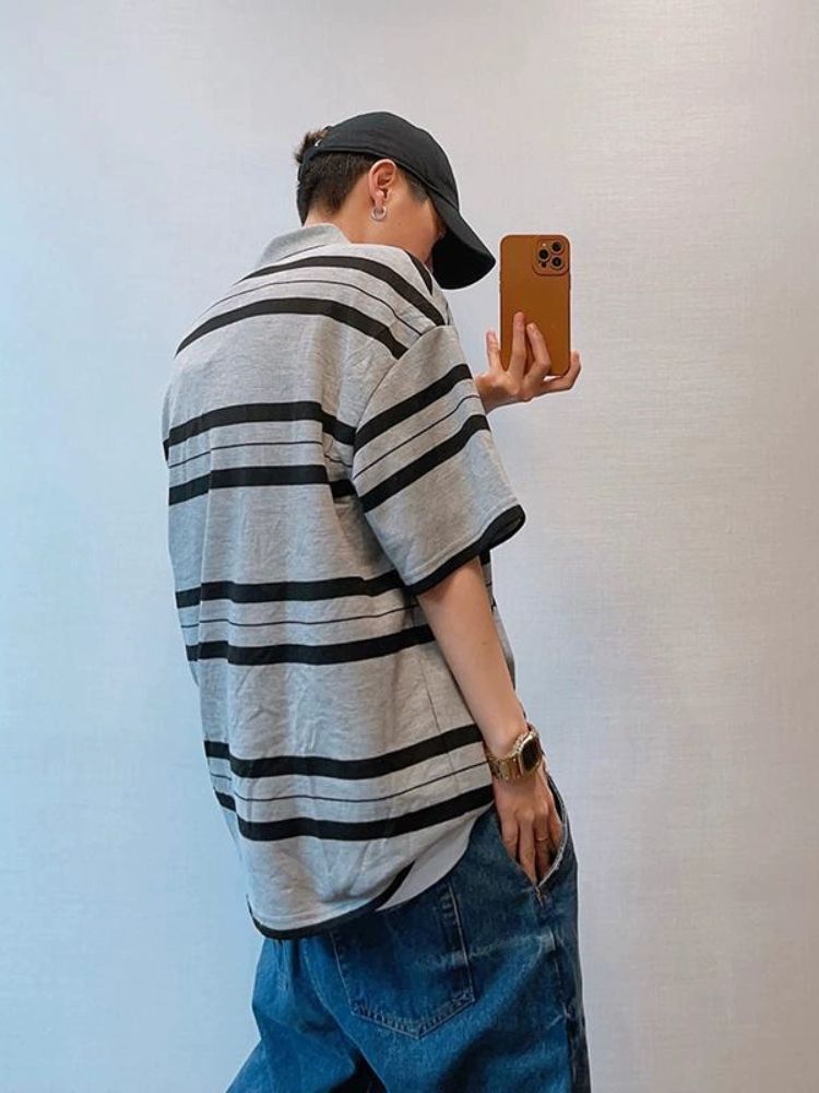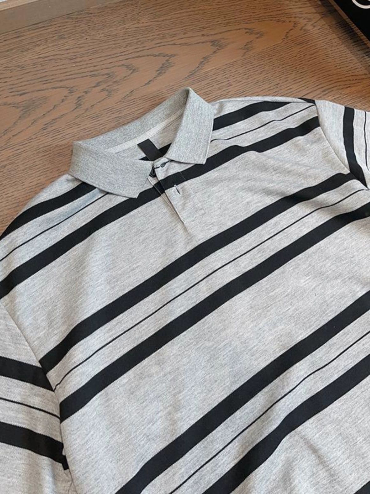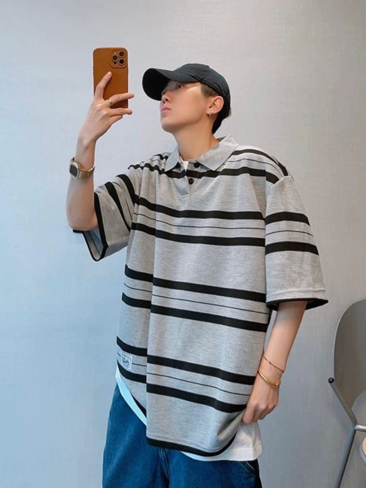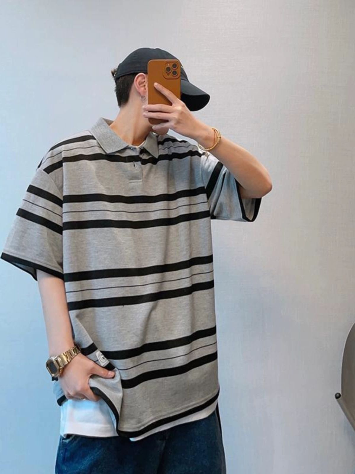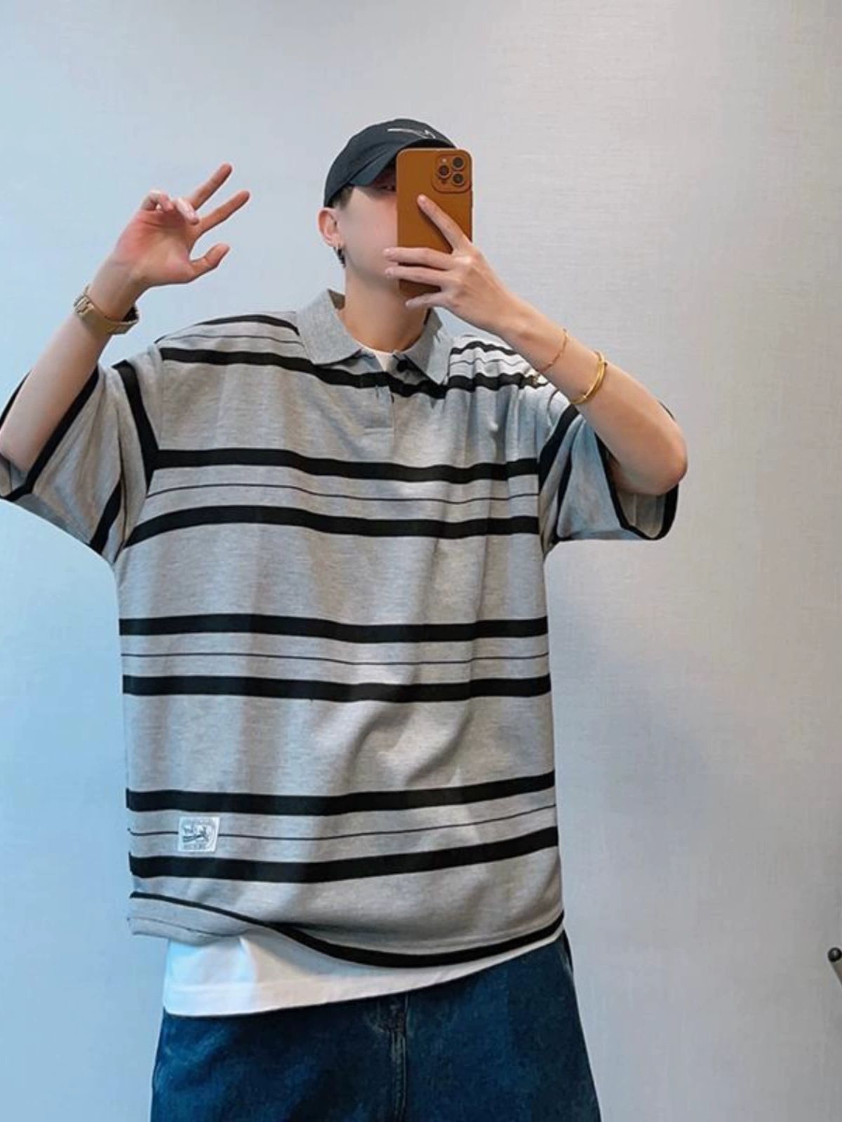 Polo衫短袖条纹重磅复古T恤男宽松翻领夏季上衣体恤