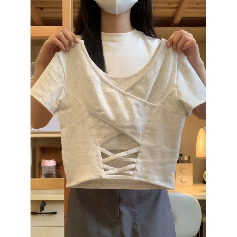 交叉漏背辣妹短款上衣女夏季新款自带胸垫设计感正肩短袖t恤
