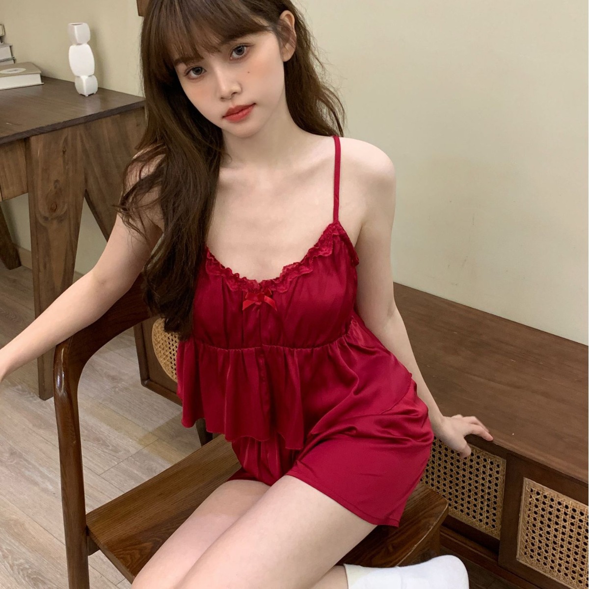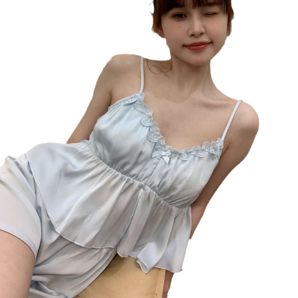 冰丝睡衣女夏季少女纯欲吊带短裤套装仿真丝睡衣女粉嫩性感家居服