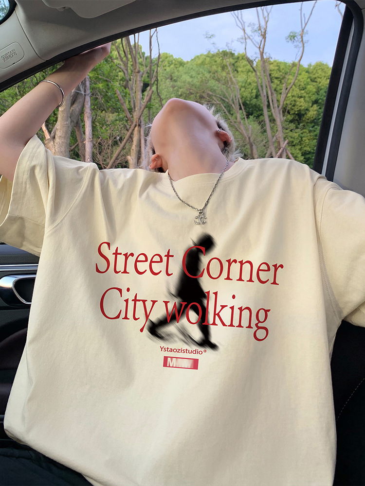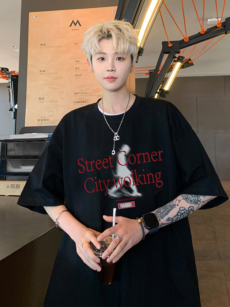 潮牌美式高街重磅短袖T恤男夏季设计感小众潮流宽松七分半袖衣服