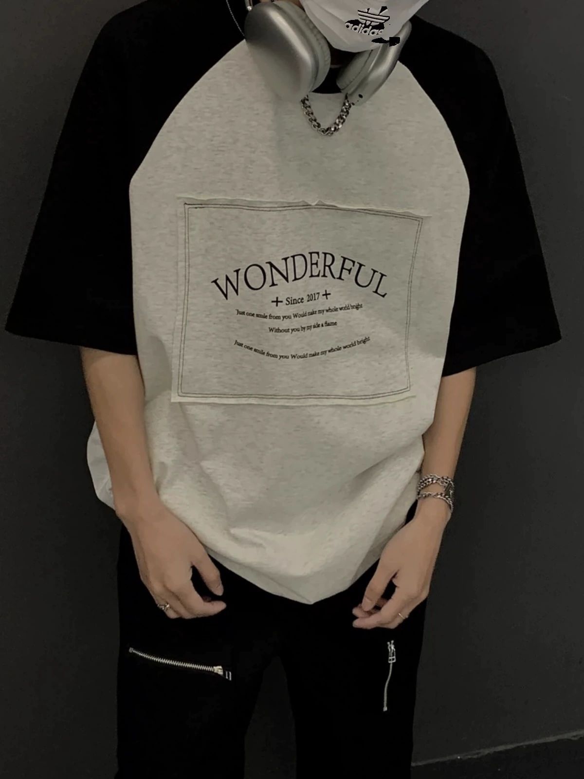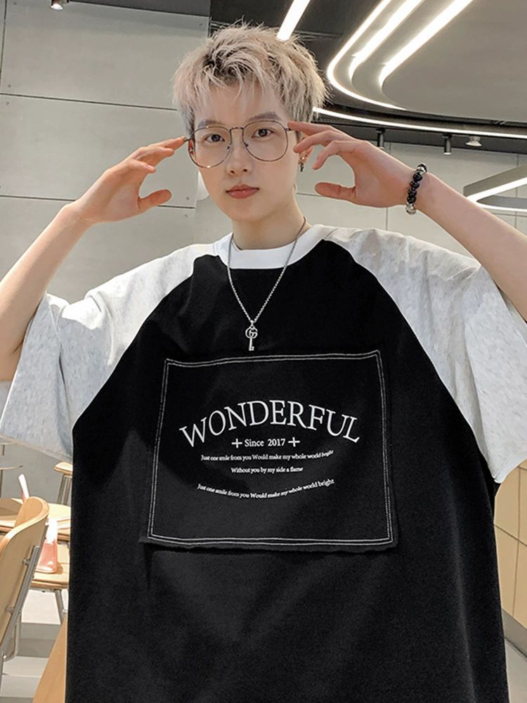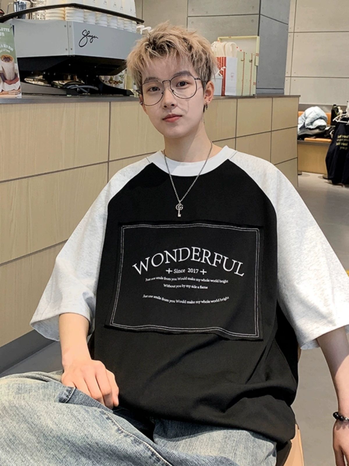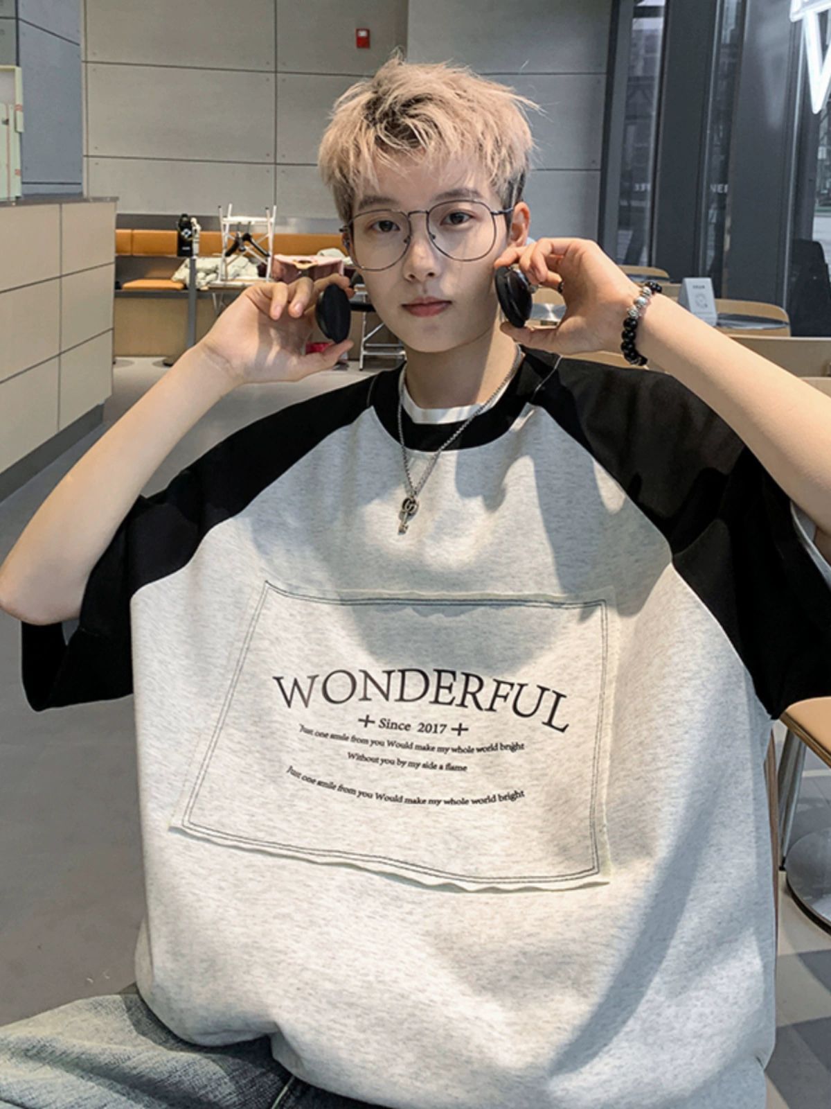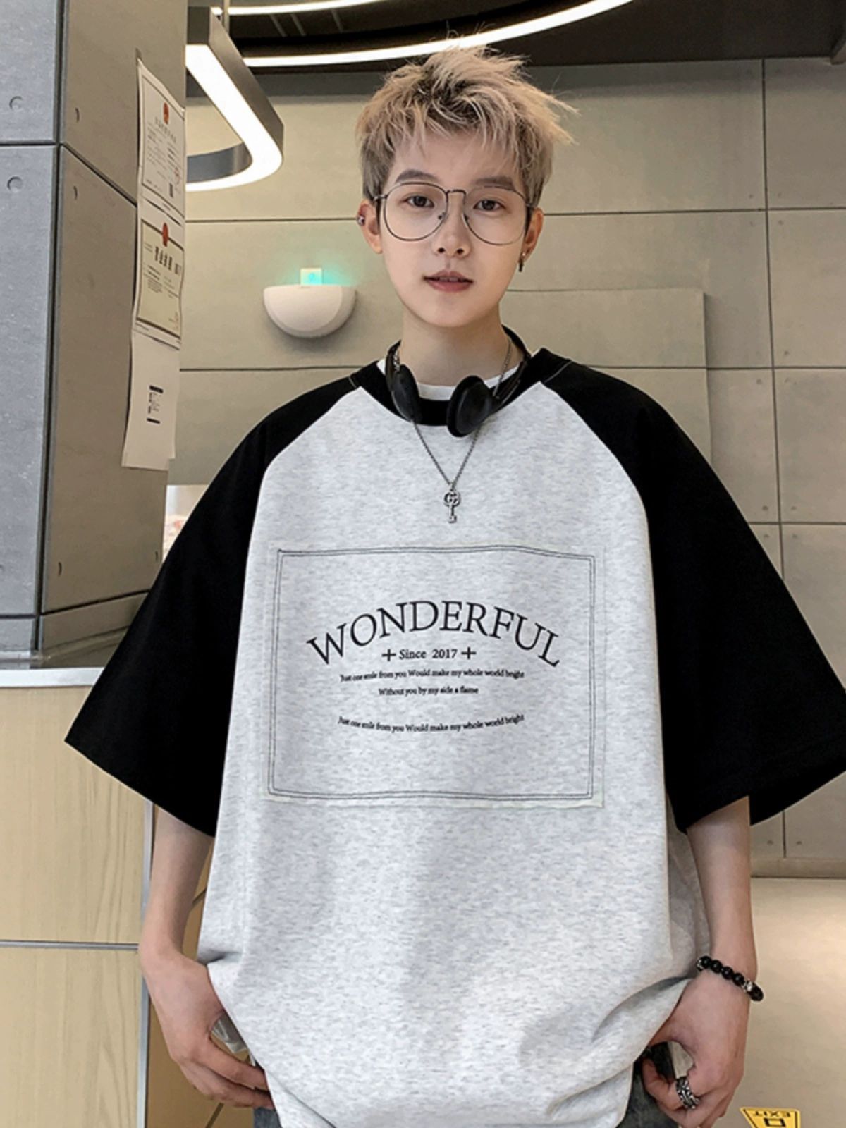 美式高街短袖T恤男夏季新款插肩袖痞帅设计感大码圆领半袖衫