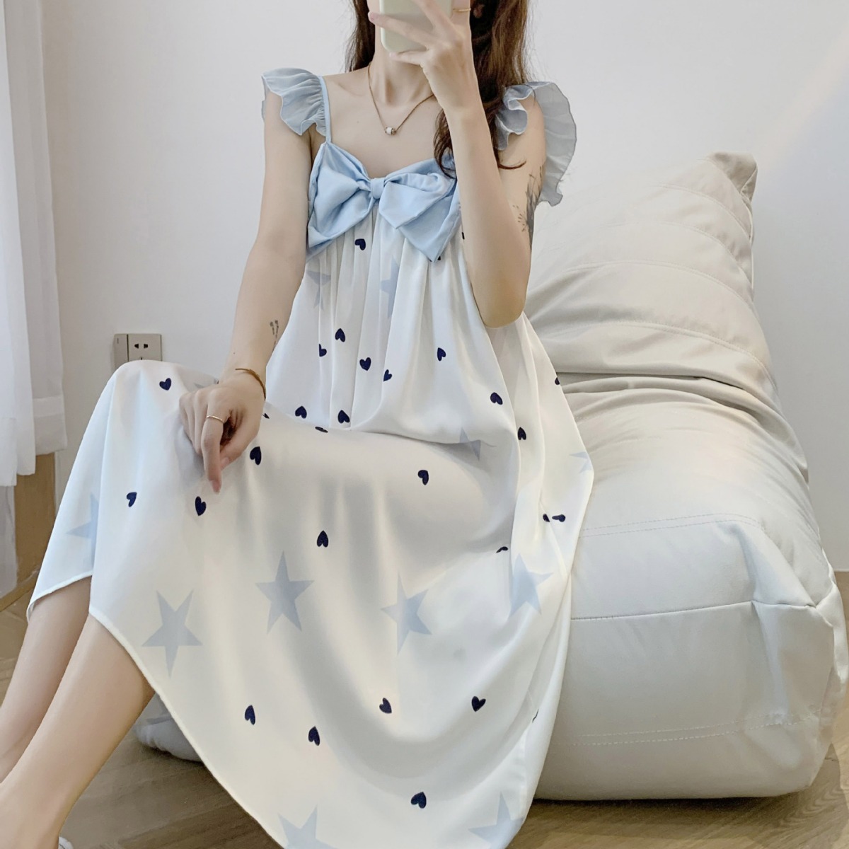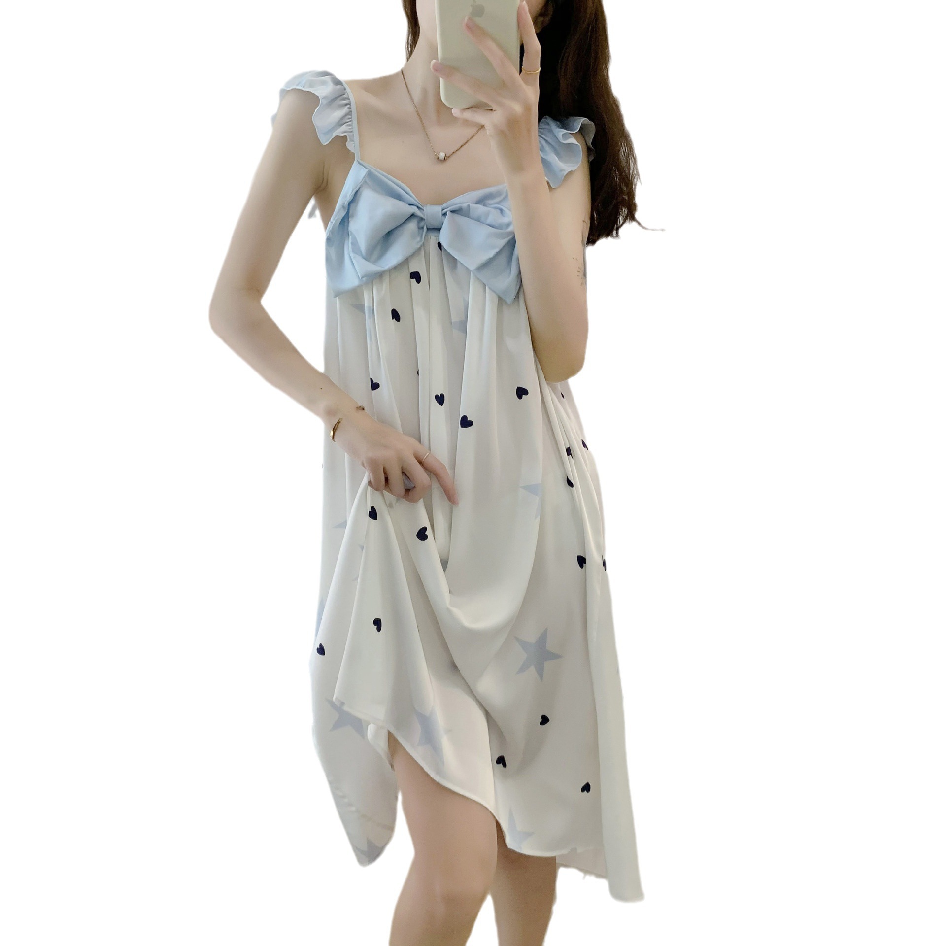 睡裙女夏季新款甜美冰丝吊带睡裙薄款蝴蝶结睡衣荷叶边少女家居服