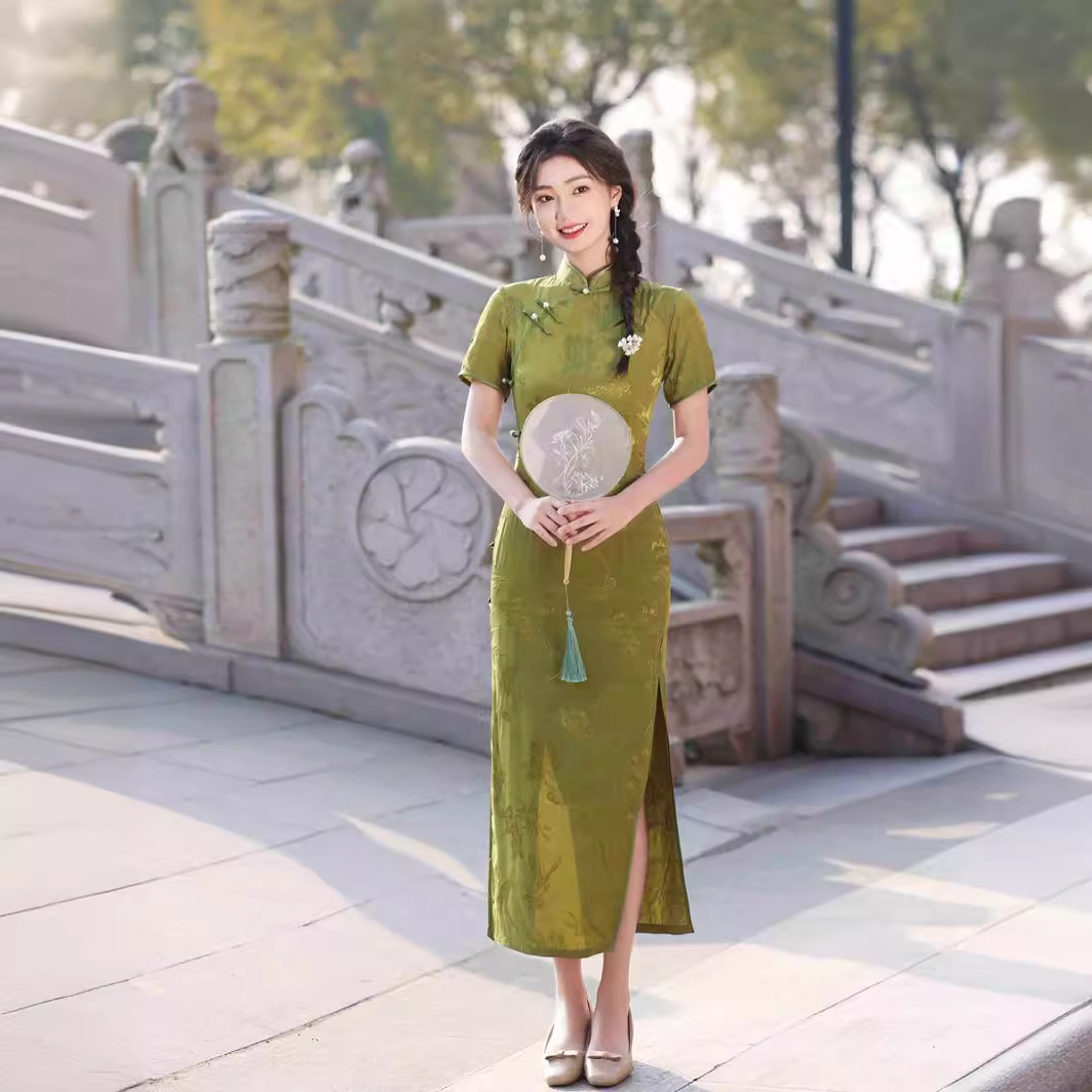 绿色人丝提花旗袍春夏新中式复古民国风改良年轻款优雅气质