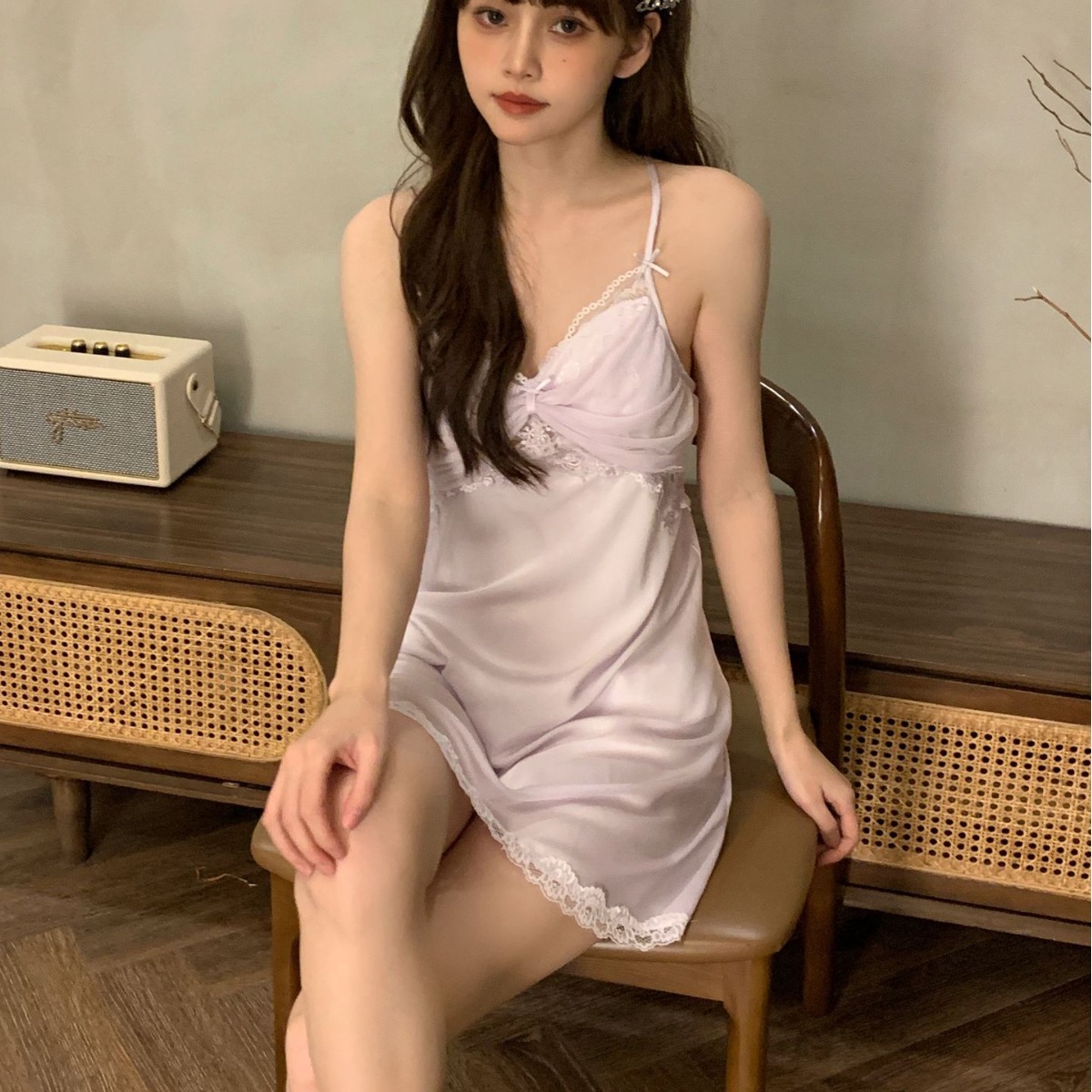 吊带睡衣女春季新款性感冰丝蕾丝带胸垫睡裙夏季网纱纯欲美背睡衣