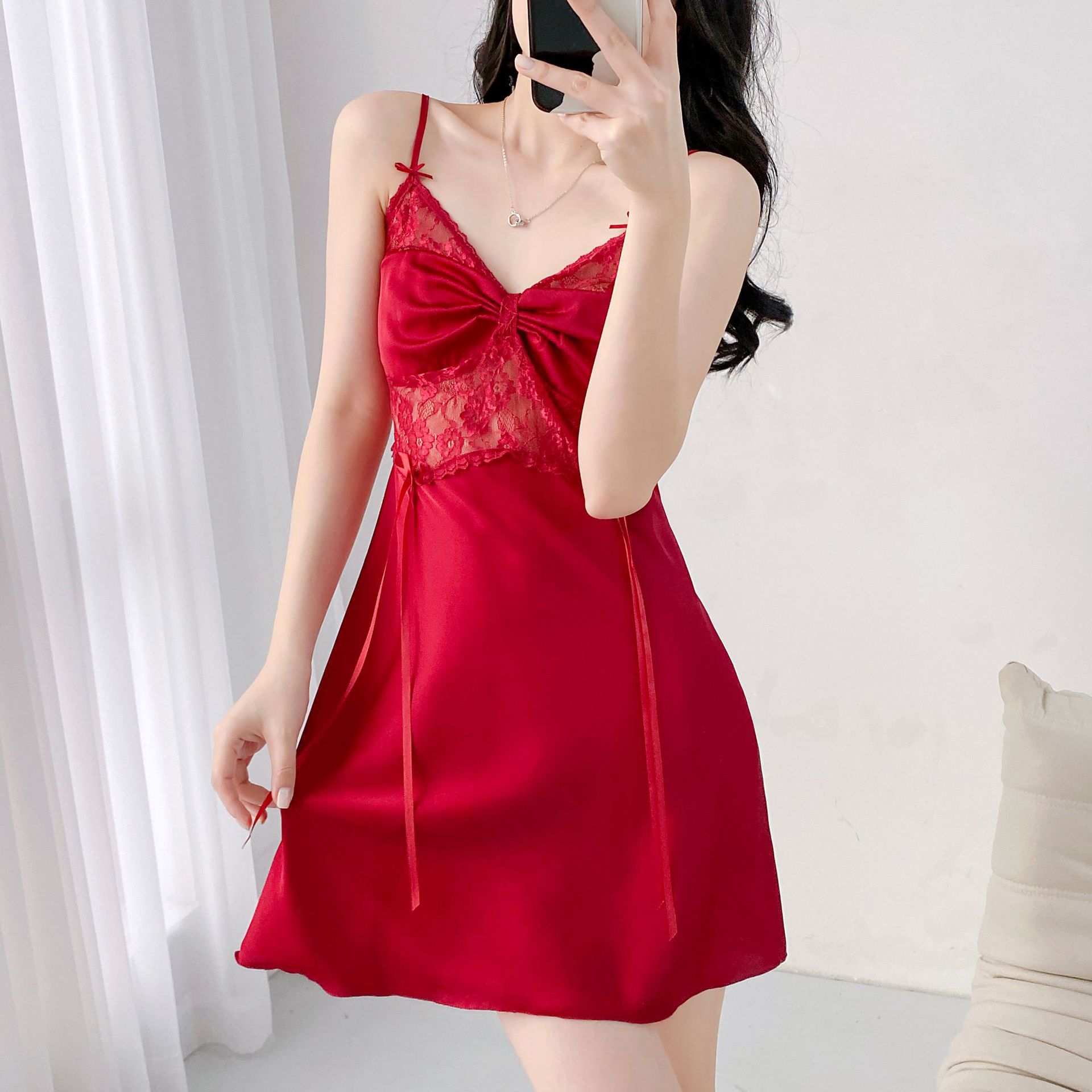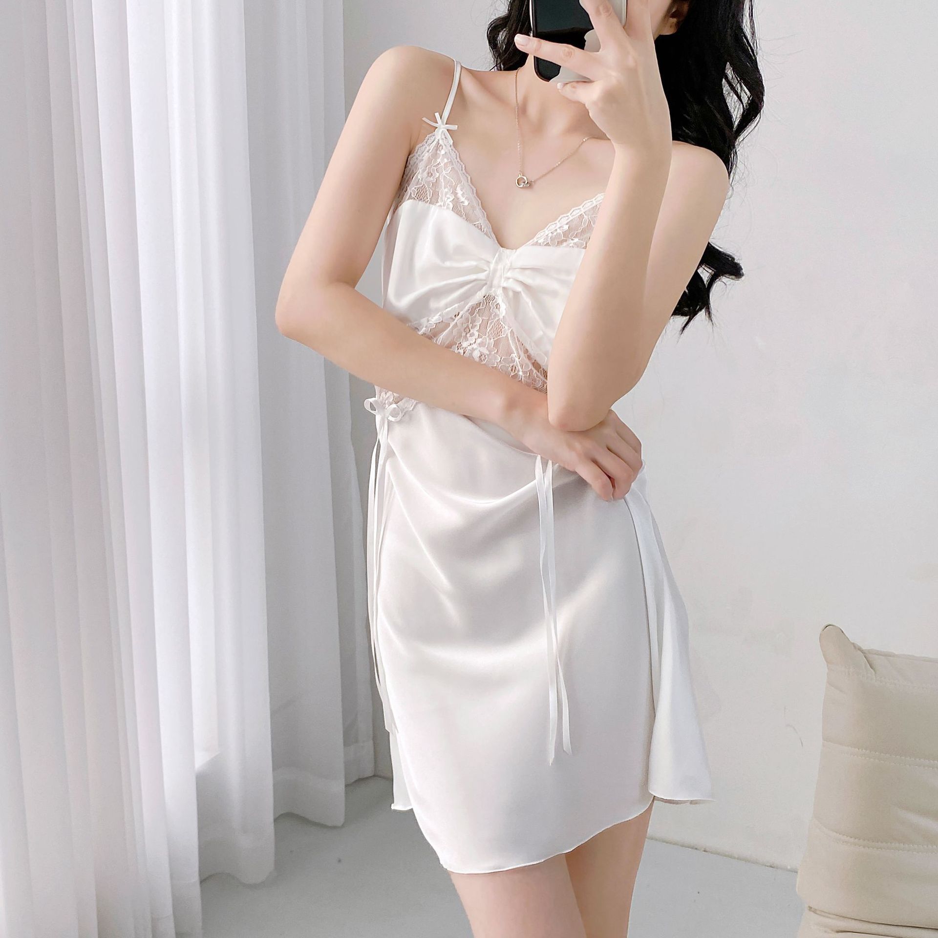 冰丝睡裙女带胸垫蕾丝镂空性感诱惑吊带睡衣纯欲风夏季丝绸睡衣薄
