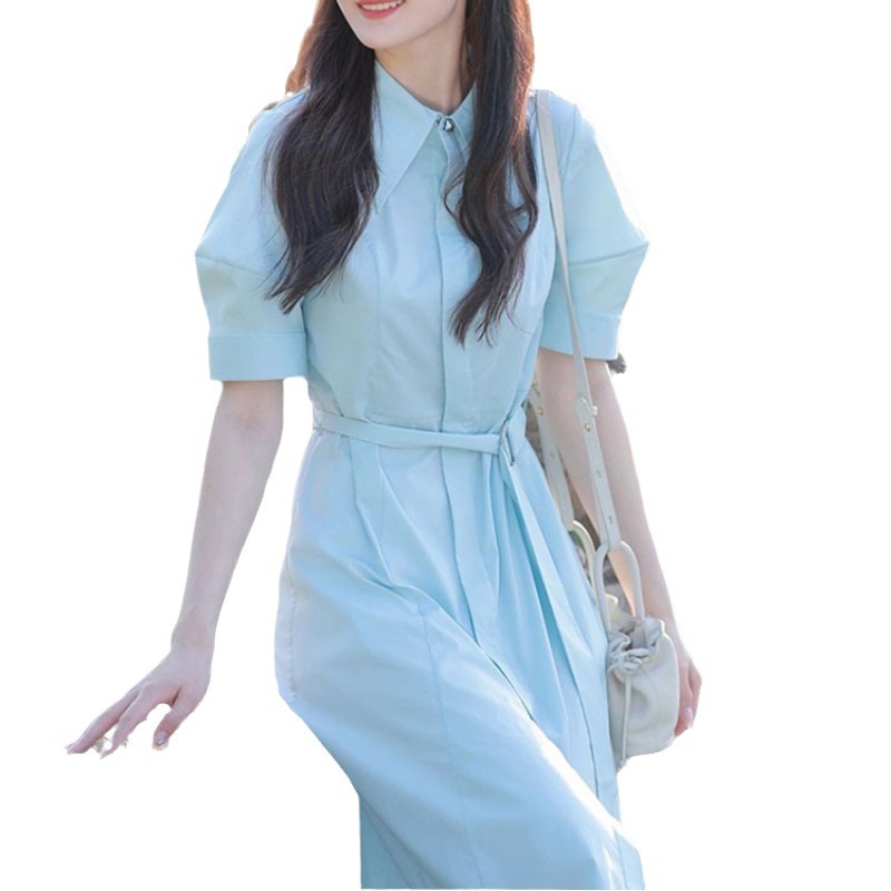 法式温柔风气质衬衫裙子夏季新款收腰泡泡袖蓝色polo连衣裙女