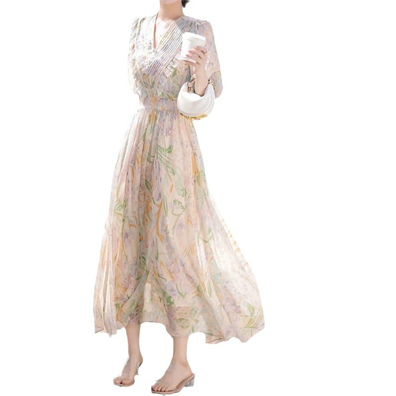 夏装新款法式初恋温柔风a字长裙气质显瘦V领雪纺碎花连衣裙女