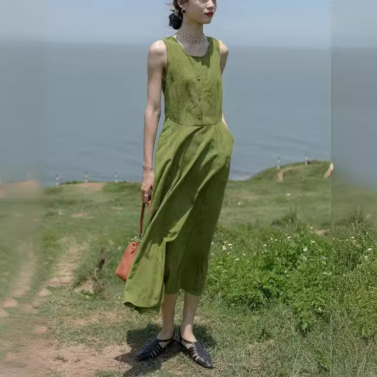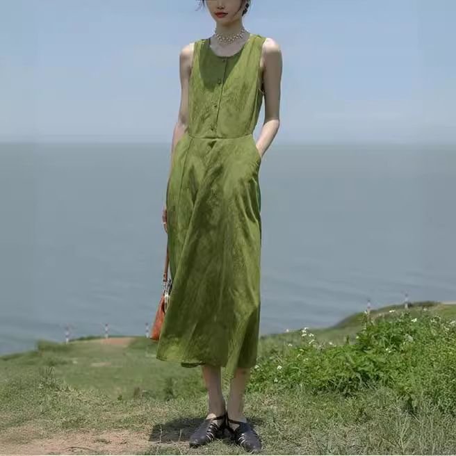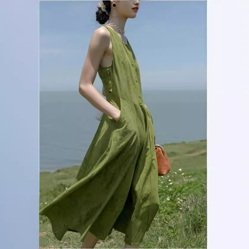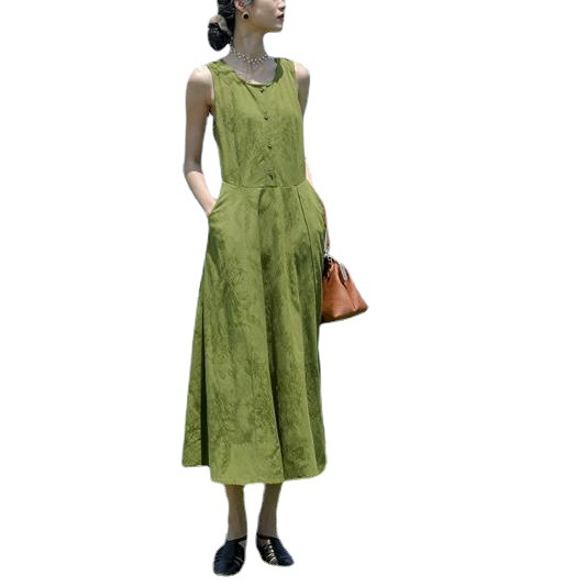 法式绿色背心裙无袖气质连衣裙女夏季设计感长裙收腰显瘦裙子