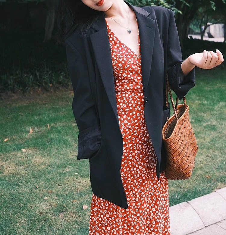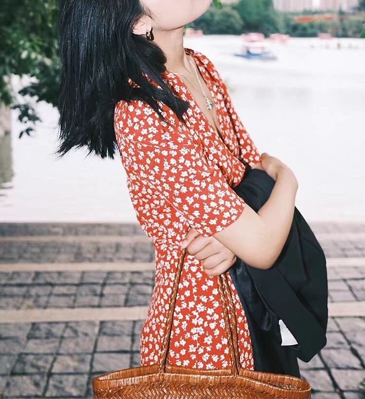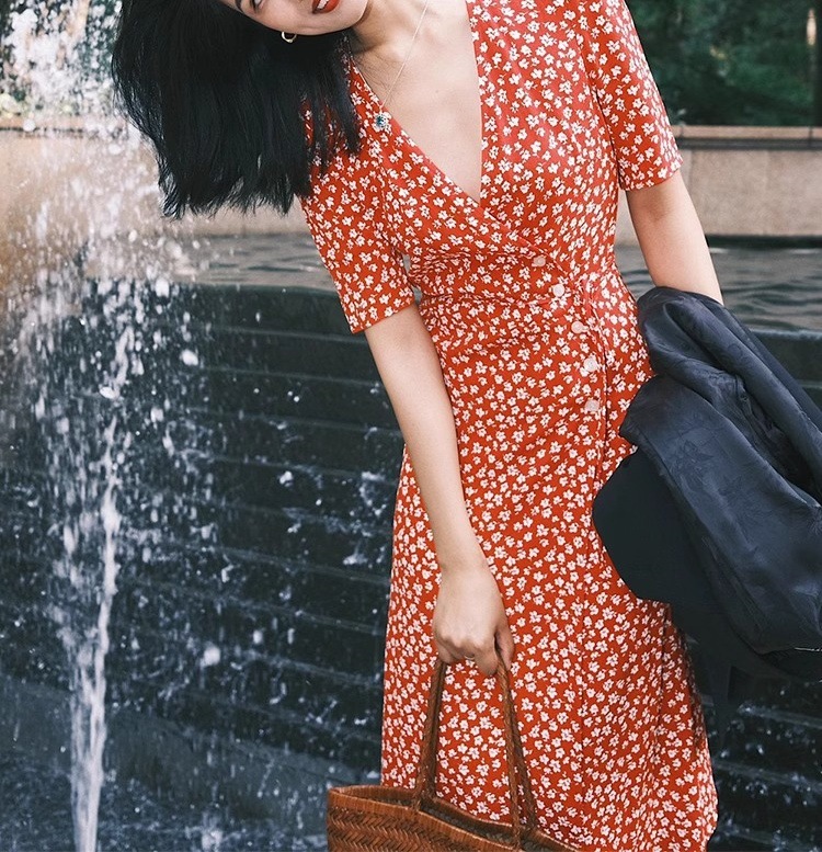 法式温柔风V领雪纺碎花连衣裙女夏季气质港风复古海边度假裙