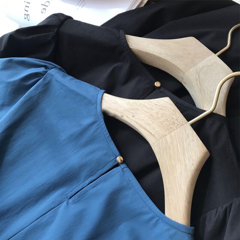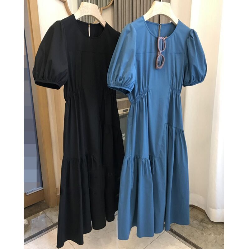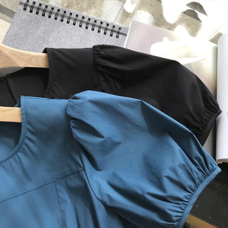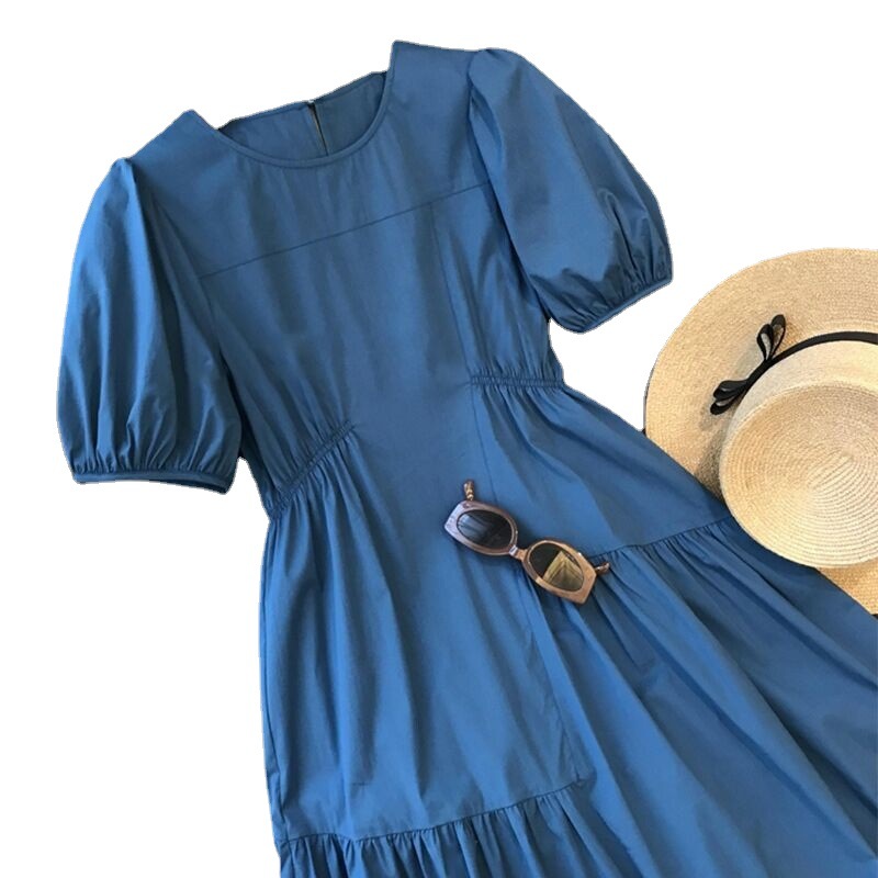 法式气质茶歇圆领显瘦裙子小众设计抽褶休闲蓝色泡泡袖连衣裙夏季