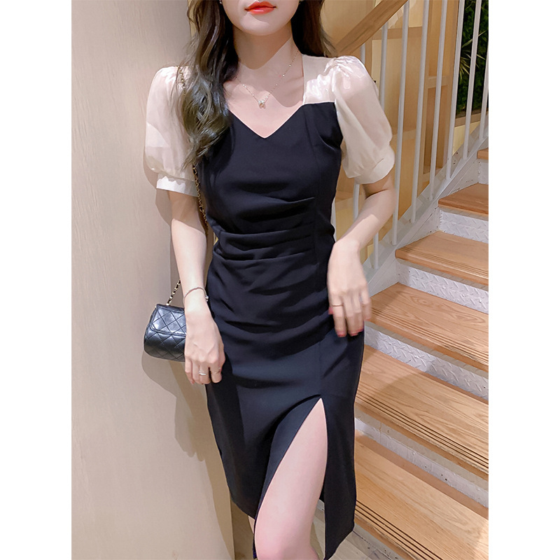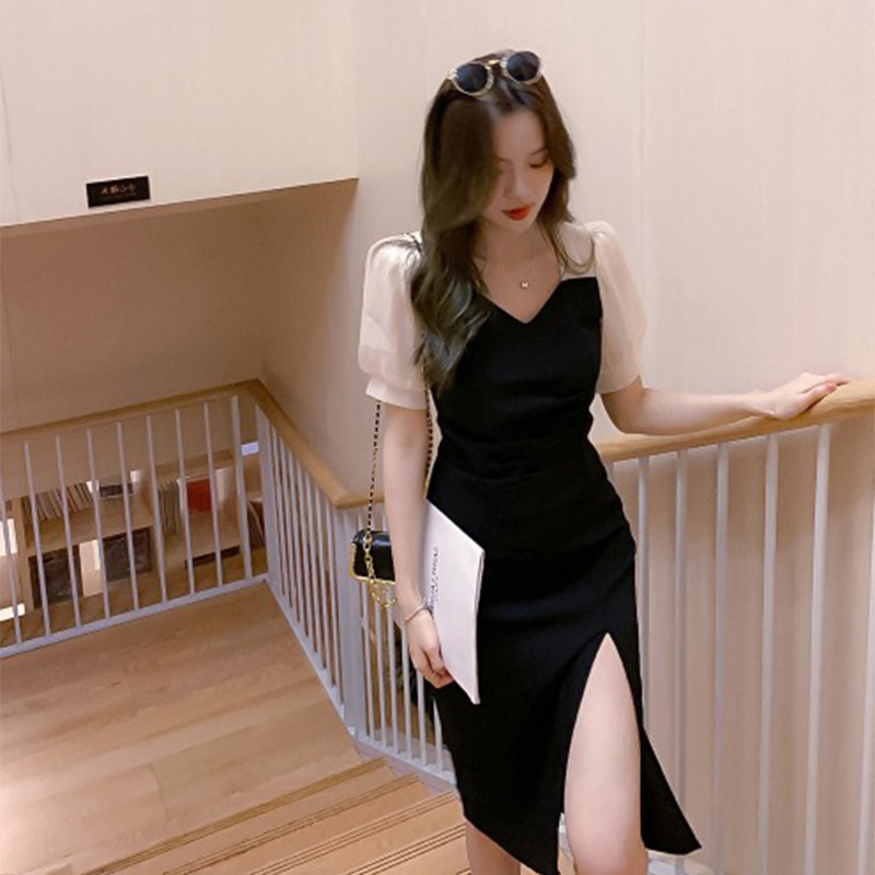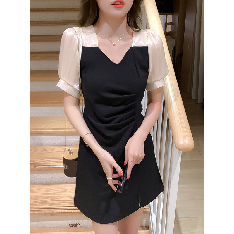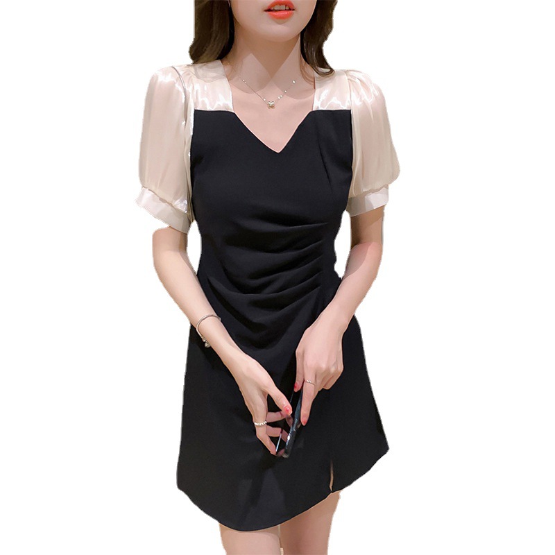 新款茶歇法式赫本风小黑裙温柔风小个子减龄气质泡泡袖连衣裙