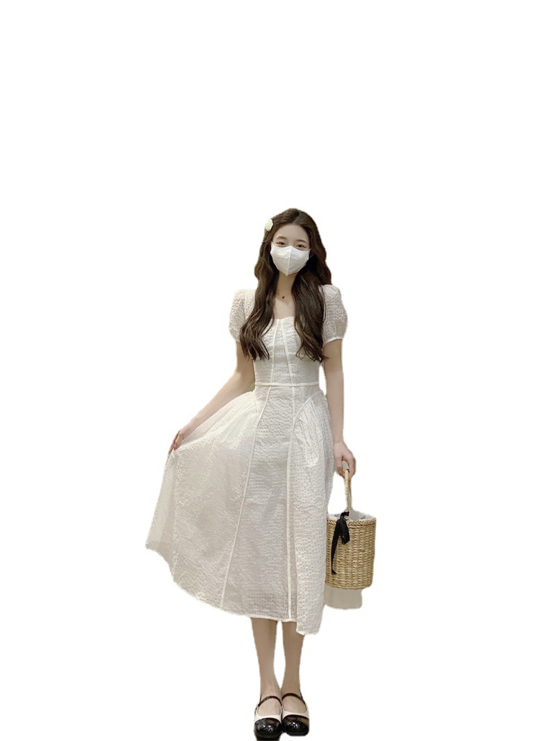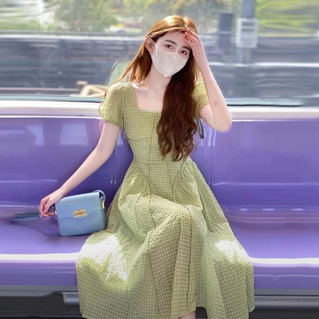 夏季新款法式初恋气质仙女长裙显瘦泡泡袖绿色连衣裙小众设计