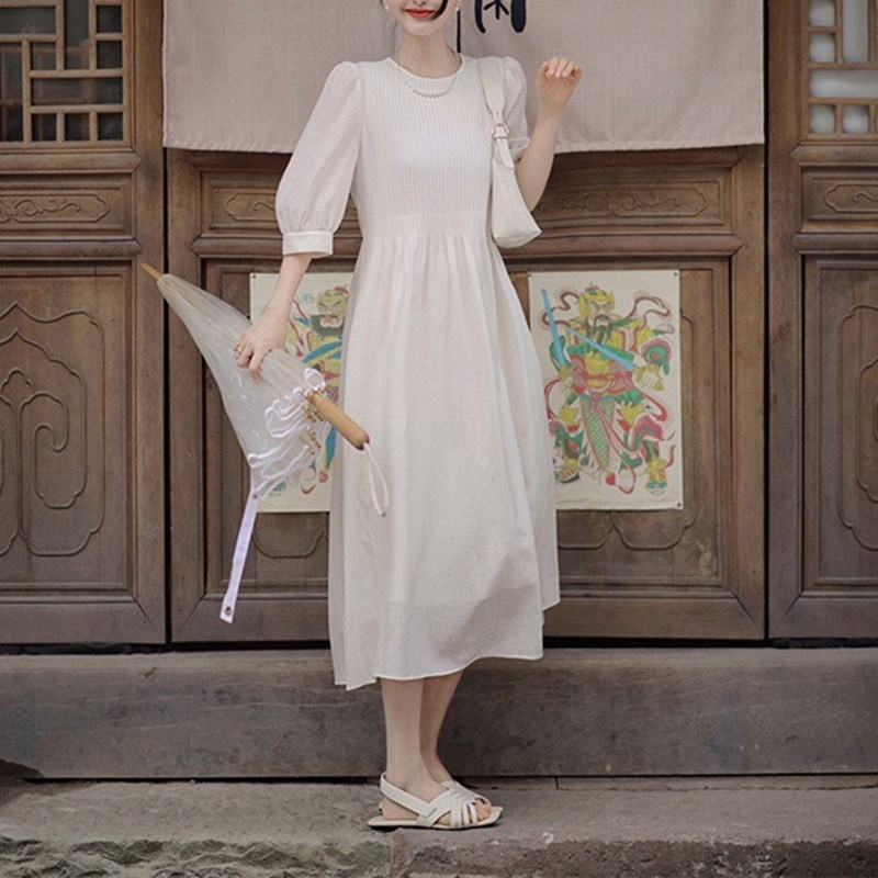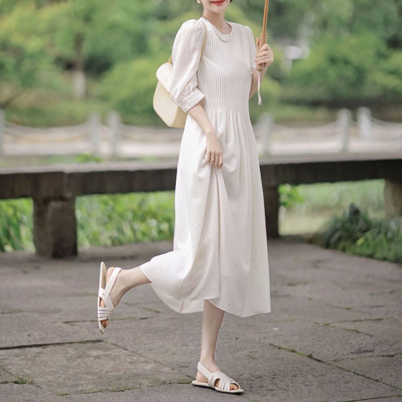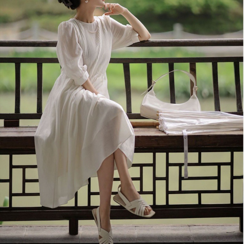 春夏新款女装法式赫本风气质女神范长裙显瘦褶皱白色连衣裙子