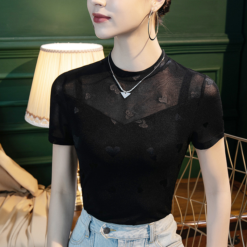 夏季新款立领蕾丝T恤女修身短袖性感镂空桃心刺绣春夏打底衫