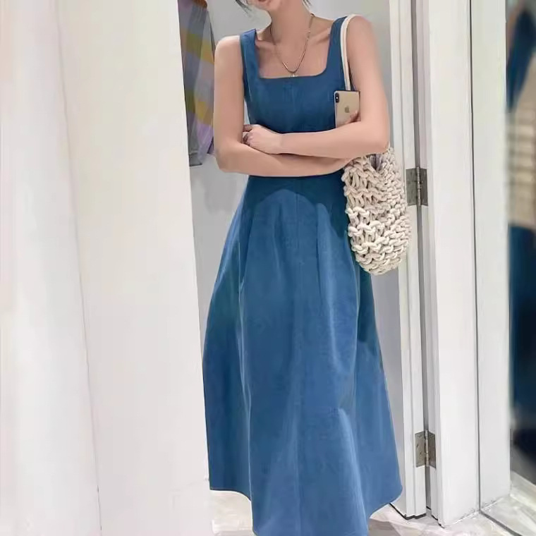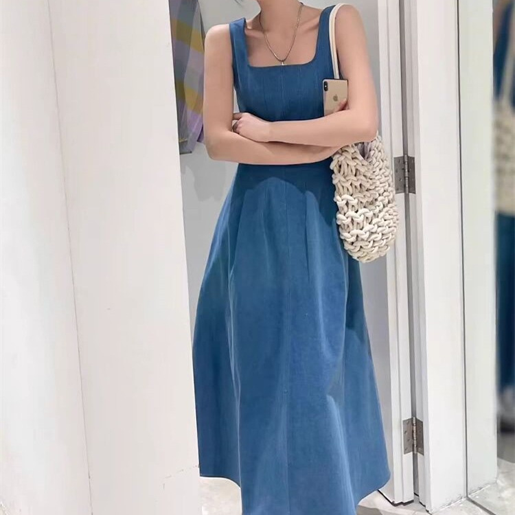 时尚背心牛仔连衣裙夏季新款法式度假风修身显瘦蓝色无袖长裙