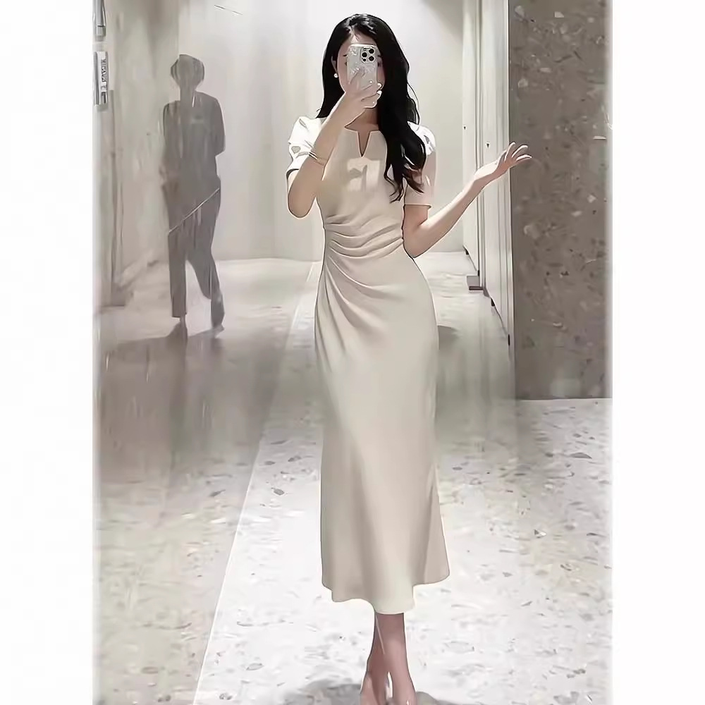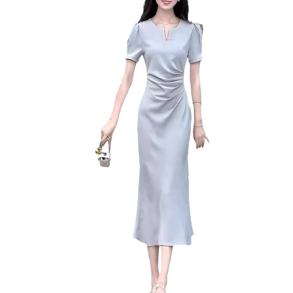 法式御姐风设计感皱褶长裙夏装新款气质显瘦醋酸缎面连衣裙子