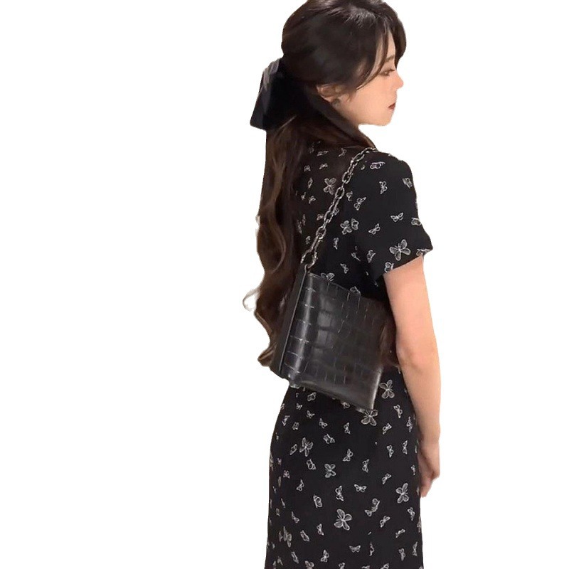 夏季新款改良旗袍裙子新中式国风盘扣漏背黑色雪纺碎花连衣裙