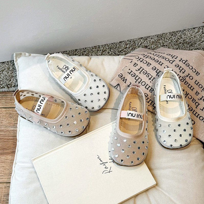 女童韩版蕾丝网面透气凉鞋2025春夏新款一脚蹬珍珠豆豆鞋公主单鞋