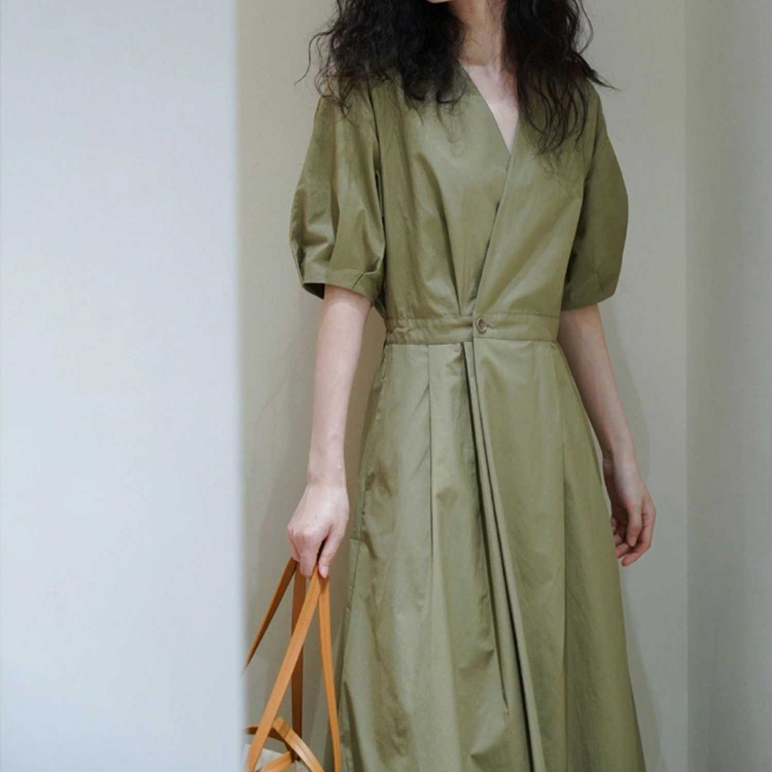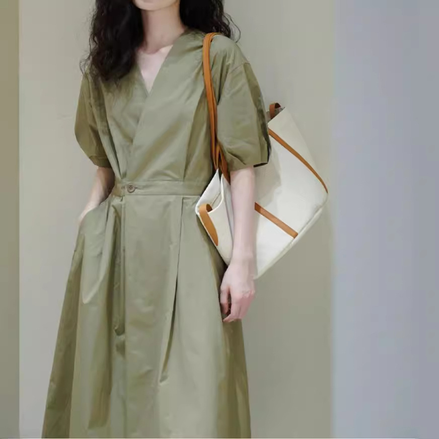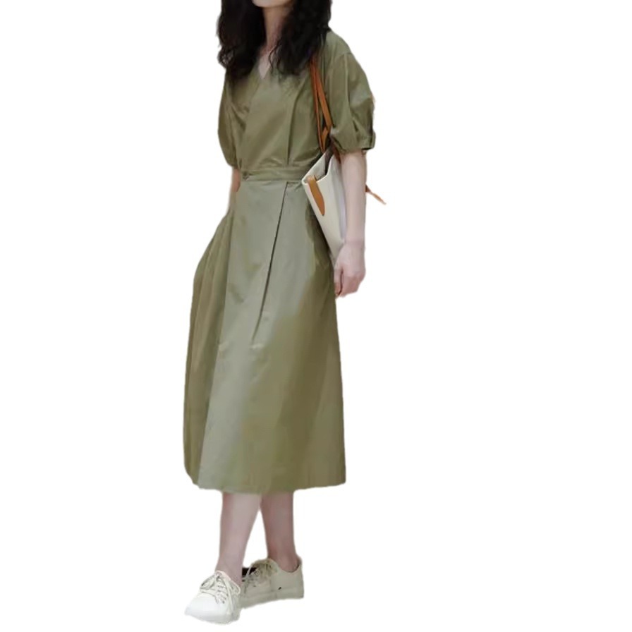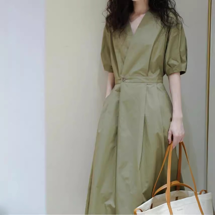 夏季新款法式御姐风气质正式场合长裙显瘦绿色V领衬衫连衣裙