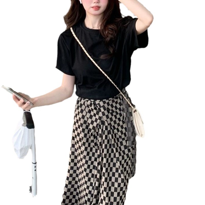 夏装年小个子减龄休闲洋气套装显瘦黑色T恤格子半身裙两件套