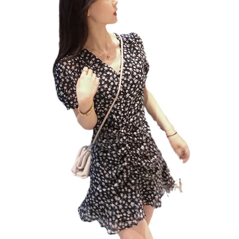 法式赫本风小黑裙夏季显瘦小个子减龄泡泡袖雪纺碎花连衣裙子