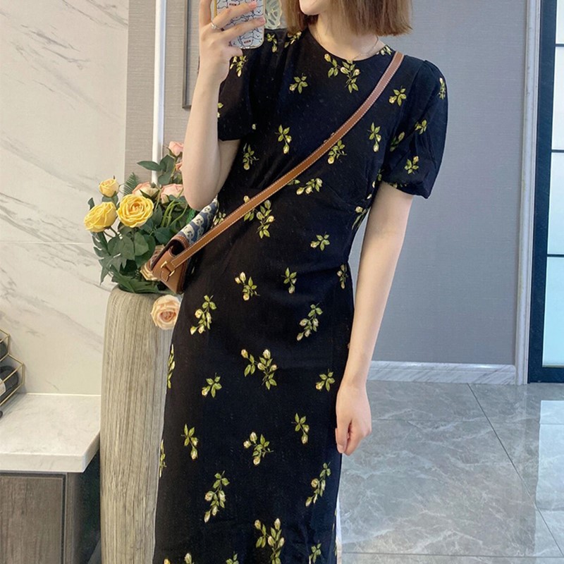 夏季新款气质名媛女神范长裙法式温柔风减龄黑色碎花连衣裙子