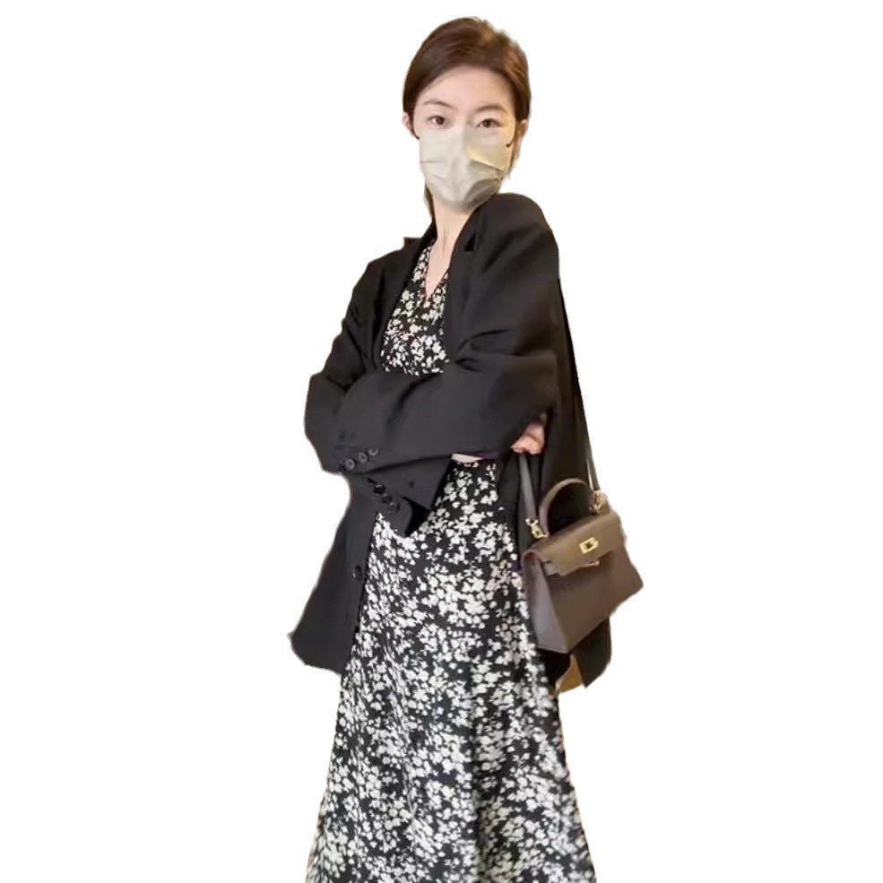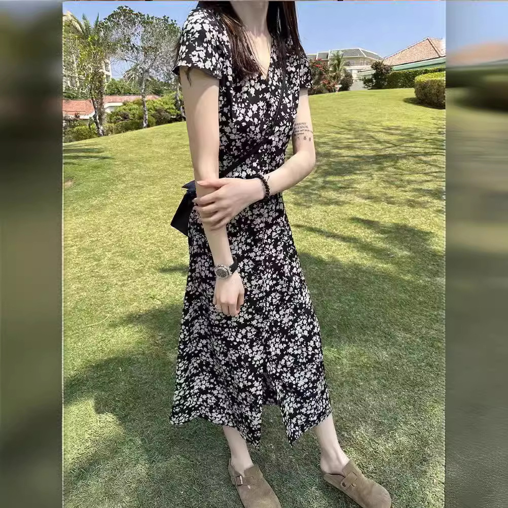 夏装新款茶歇法式复古赫本风长裙显瘦黑色V领碎花雪纺连衣裙